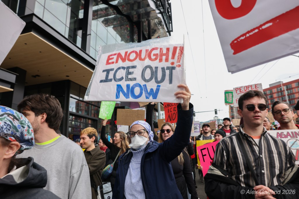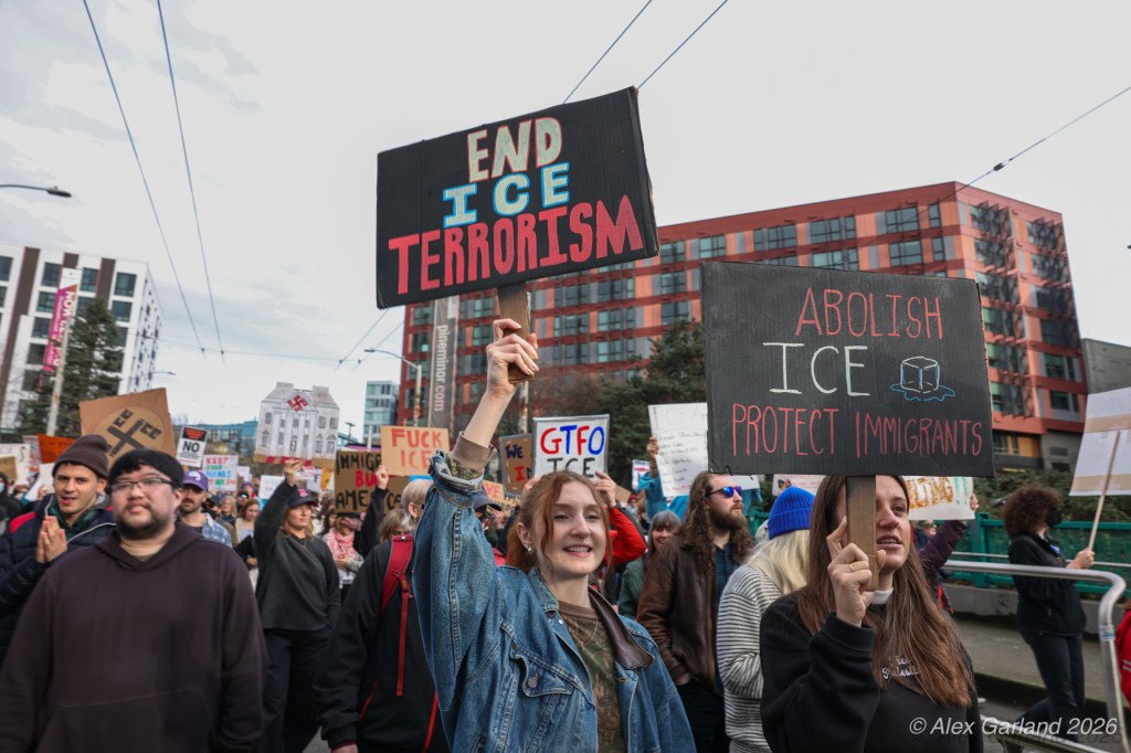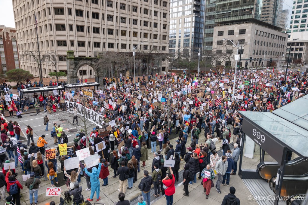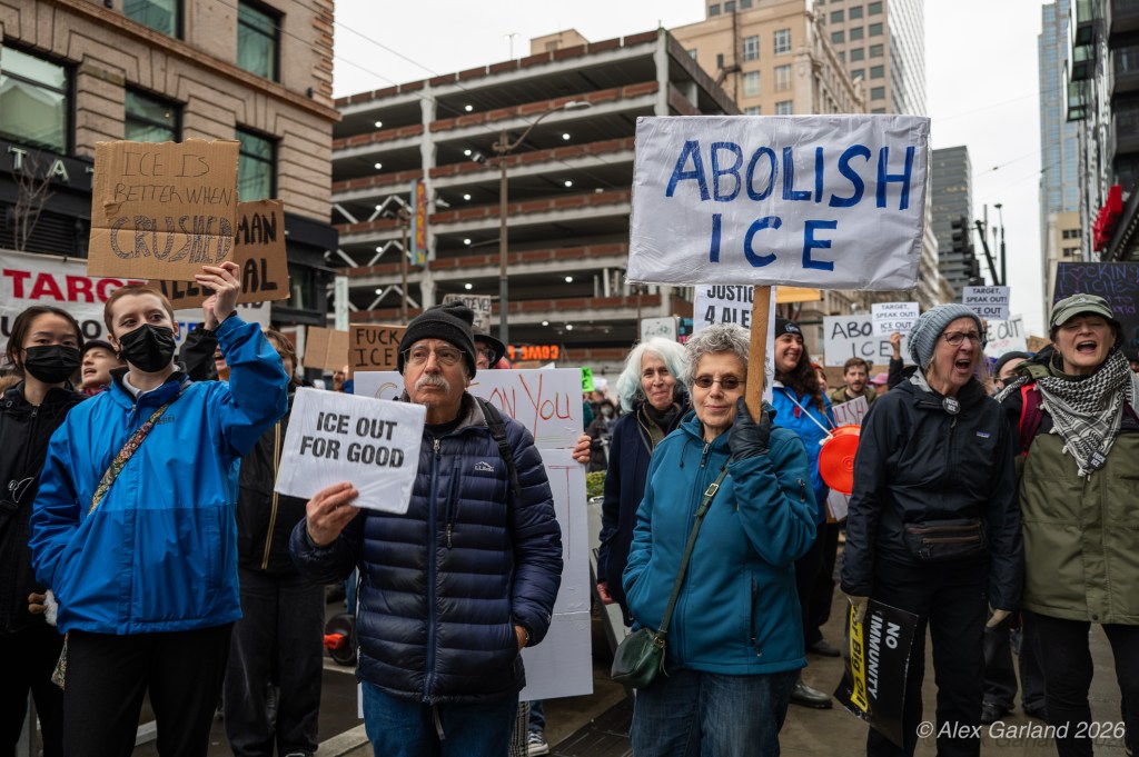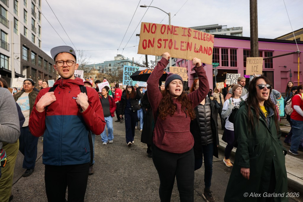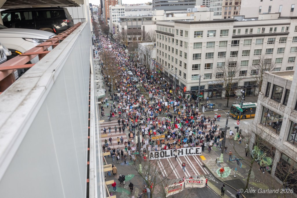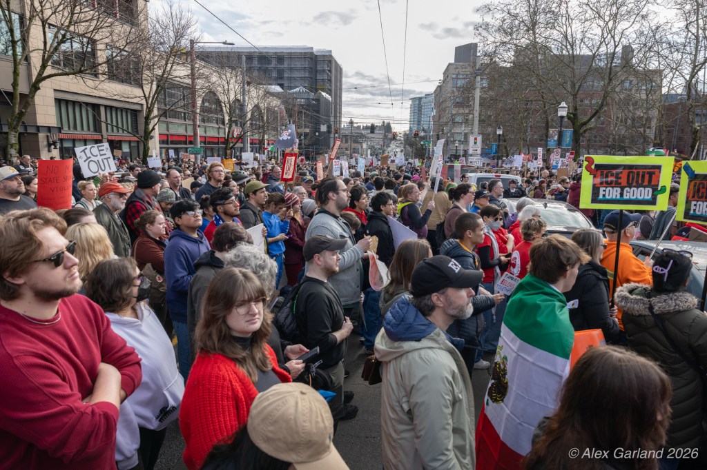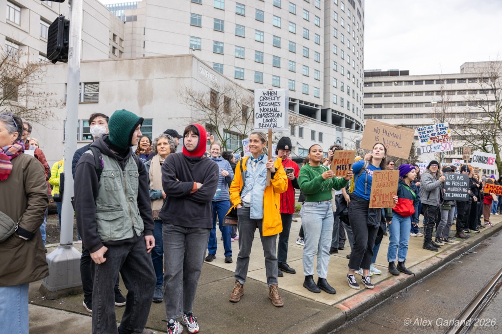 From Seattle Central, the march continued down Pine Street before turning left onto 2nd Avenue and heading into downtown Seattle. The procession moved through the commercial core as participants chanted “No justice, no peace. No ICE in our streets.” Hundreds of demonstrators gradually left the crowd along the route and the march concluded at the Henry M. Jackson Federal Building, where the remaining participants gathered for a short rally.