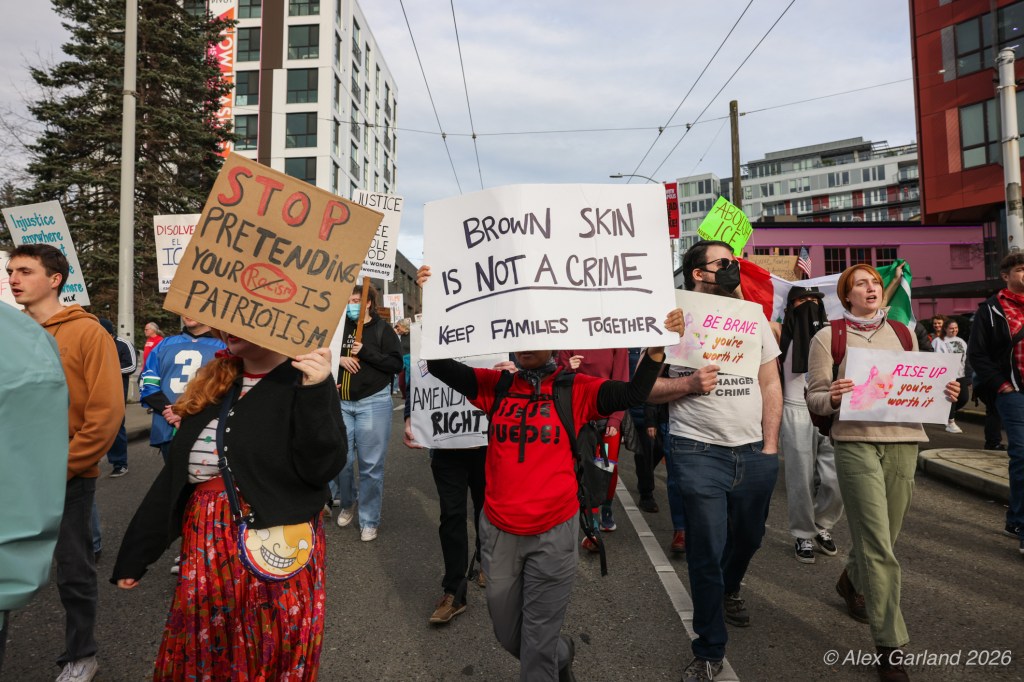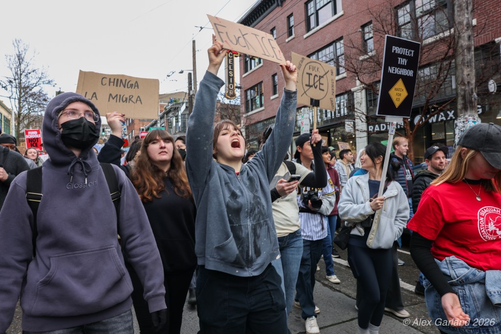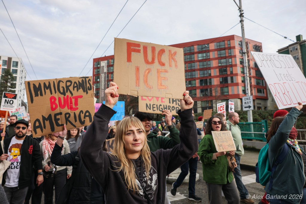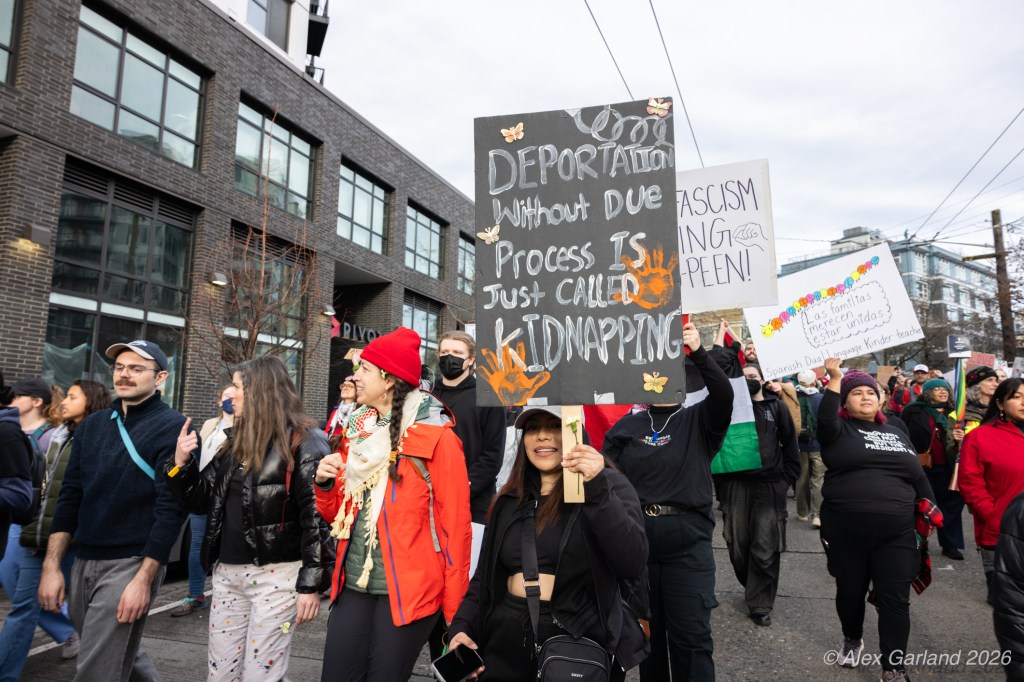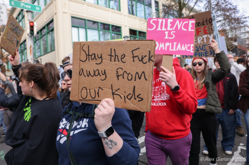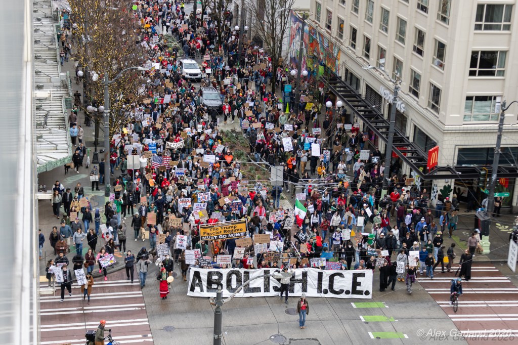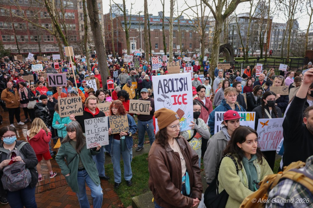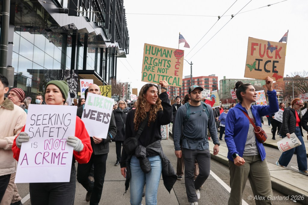 From Seattle Central, the march continued down Pine Street before turning left onto 2nd Avenue and heading into downtown Seattle. The procession moved through the commercial core as participants chanted “No justice, no peace. No ICE in our streets.” Hundreds of demonstrators gradually left the crowd along the route and the march concluded at the Henry M. Jackson Federal Building, where the remaining participants gathered for a short rally.