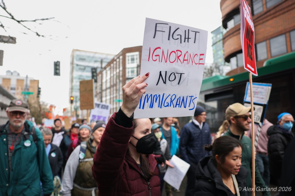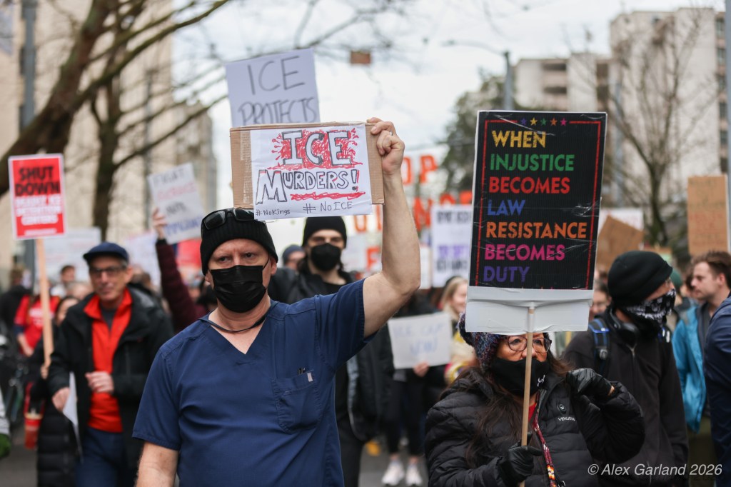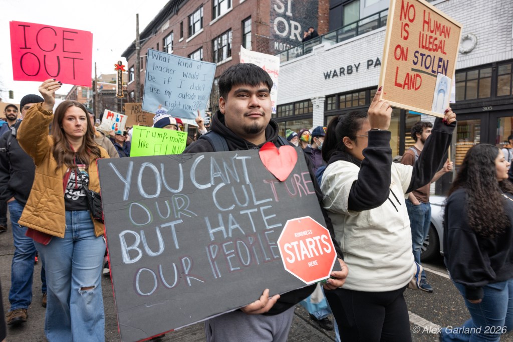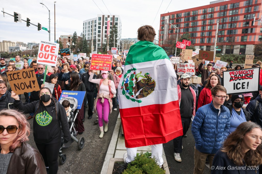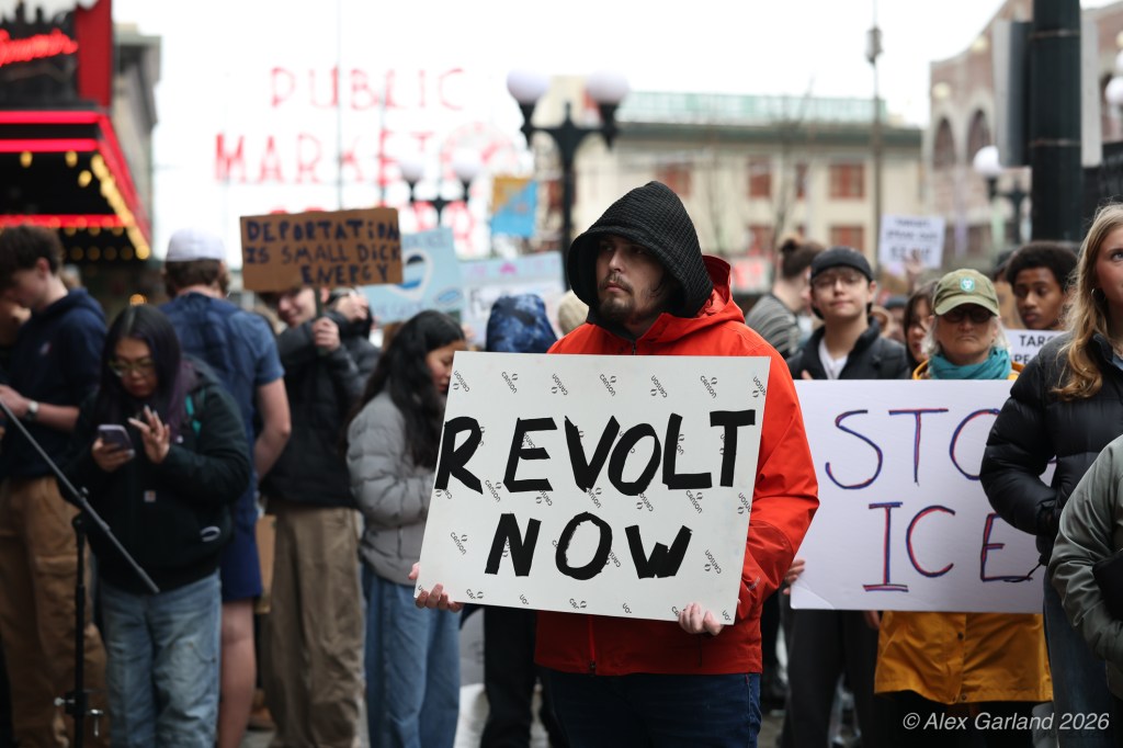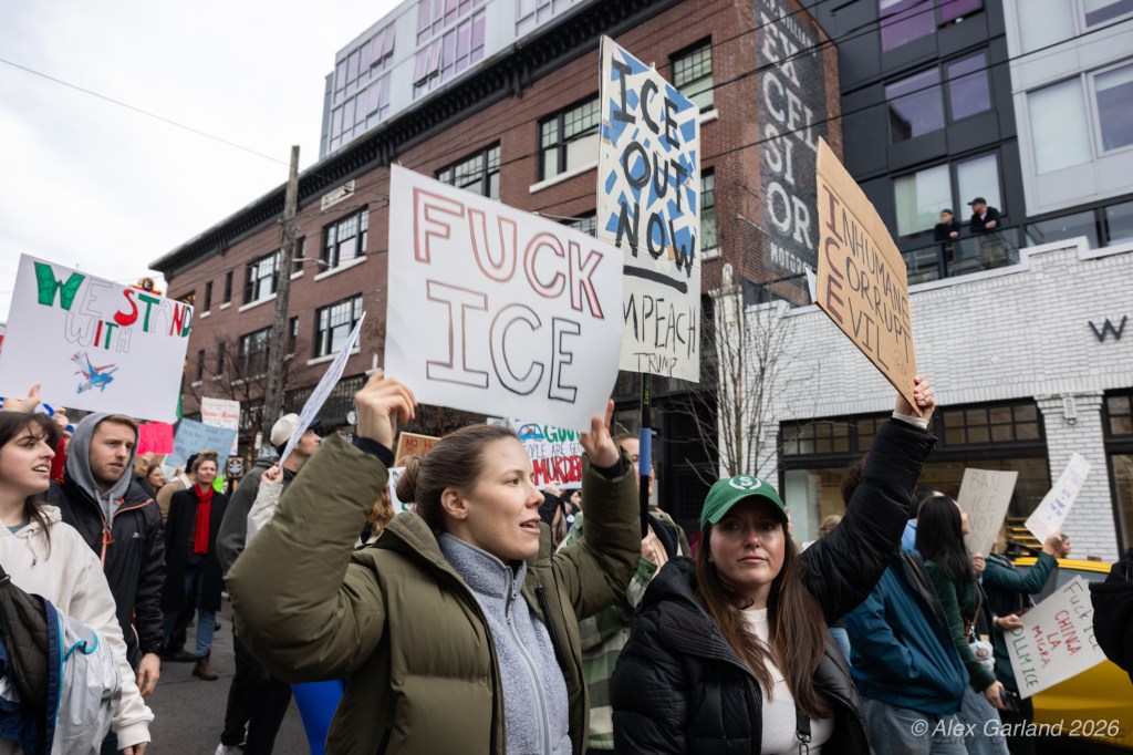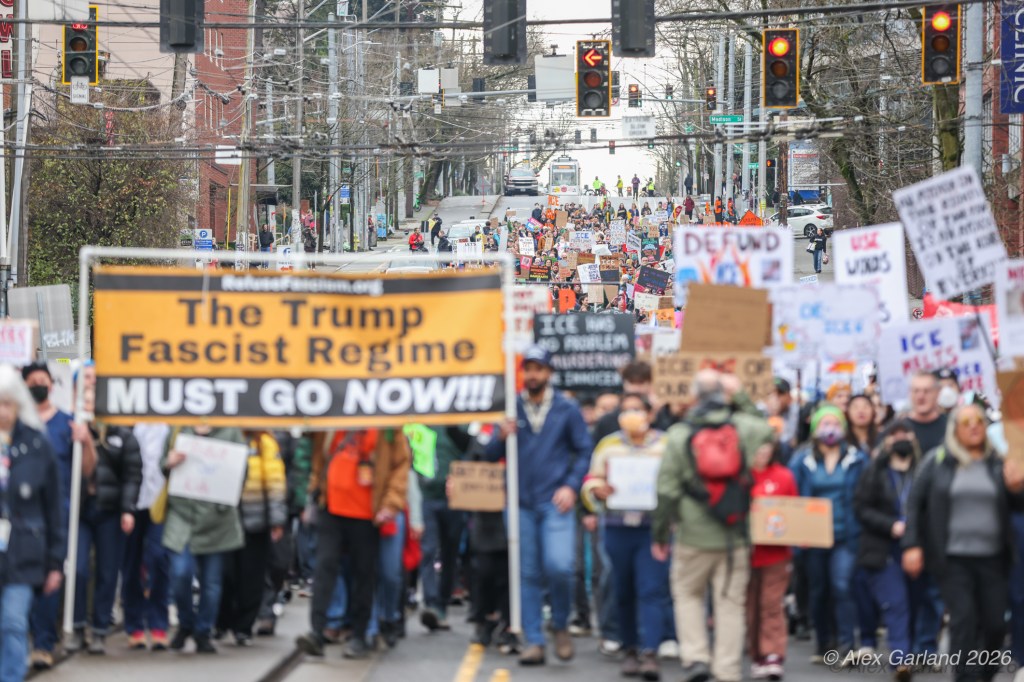 From Seattle Central, the march continued down Pine Street before turning left onto 2nd Avenue and heading into downtown Seattle. The procession moved through the commercial core as participants chanted “No justice, no peace. No ICE in our streets.” Hundreds of demonstrators gradually left the crowd along the route and the march concluded at the Henry M. Jackson Federal Building, where the remaining participants gathered for a short rally.