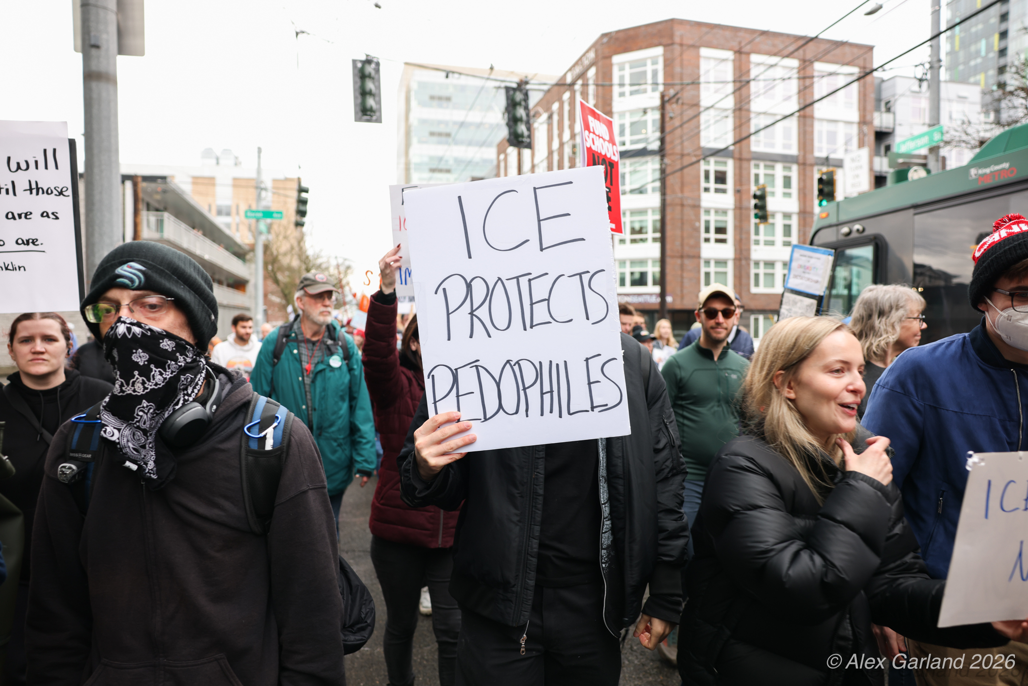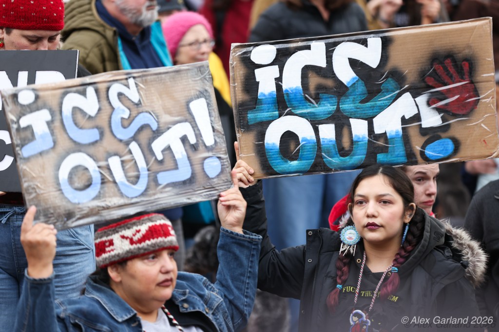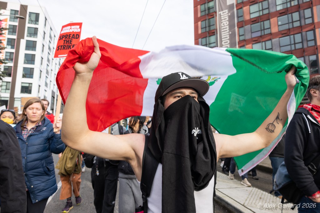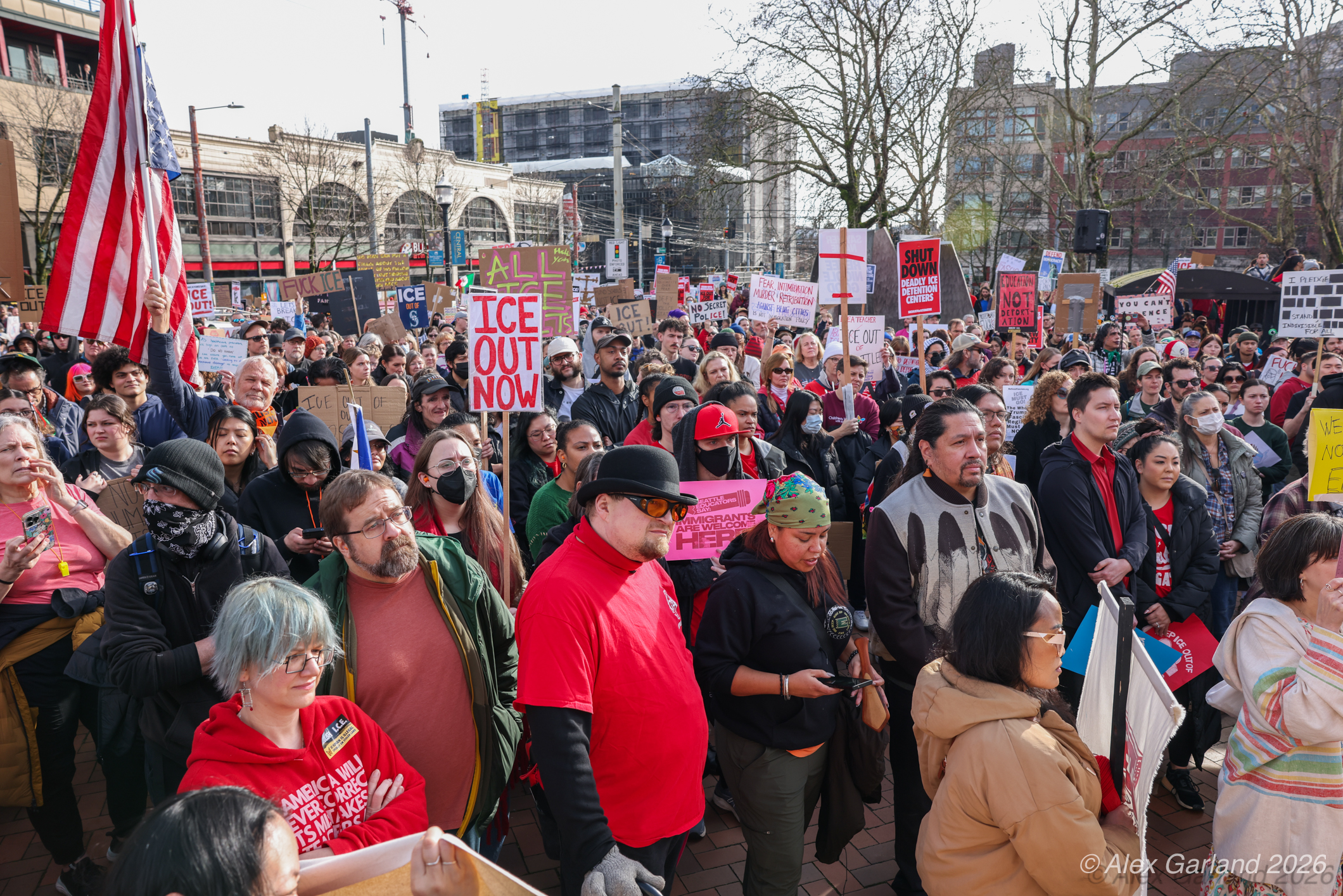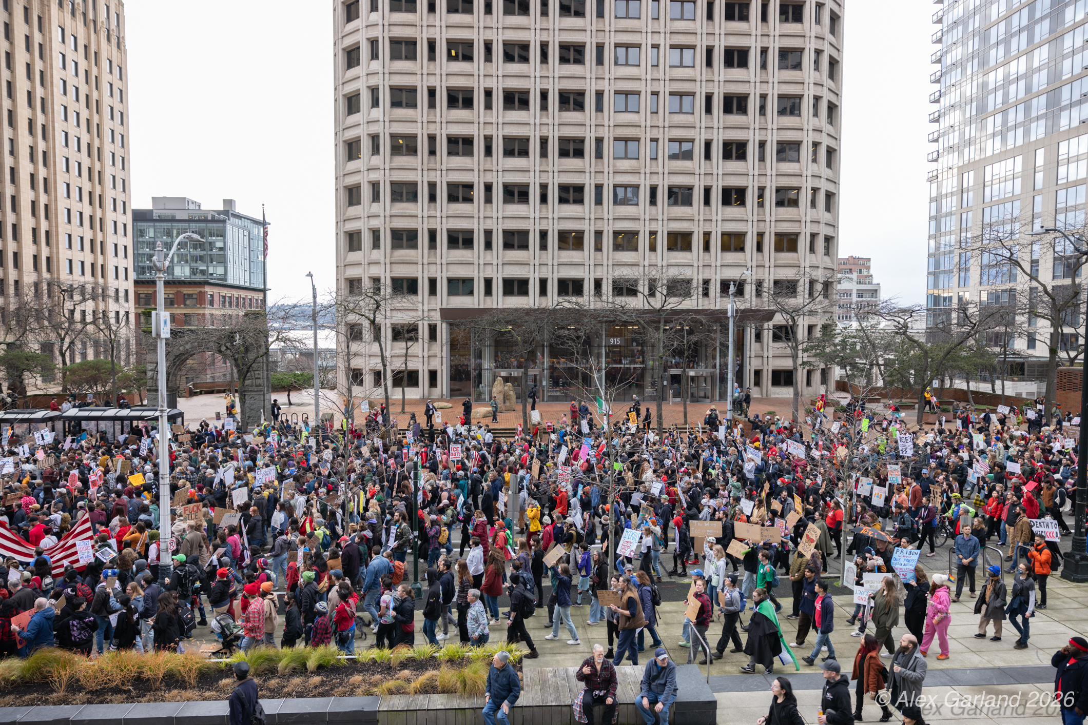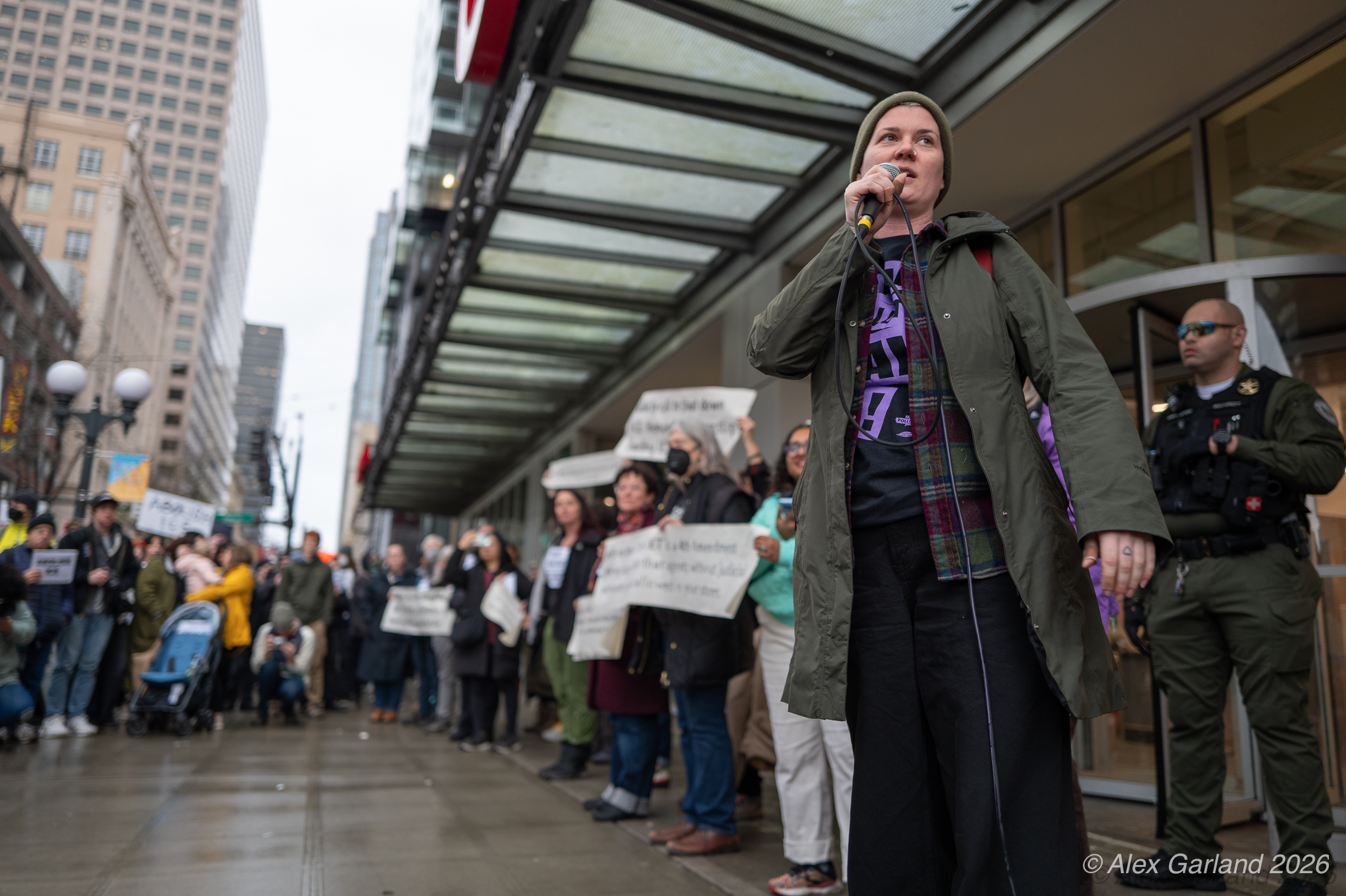 From Seattle Central, the march continued down Pine Street before turning left onto 2nd Avenue and heading into downtown Seattle. The procession moved through the commercial core as participants chanted “No justice, no peace. No ICE in our streets.” Hundreds of demonstrators gradually left the crowd along the route and the march concluded at the Henry M. Jackson Federal Building, where the remaining participants gathered for a short rally.