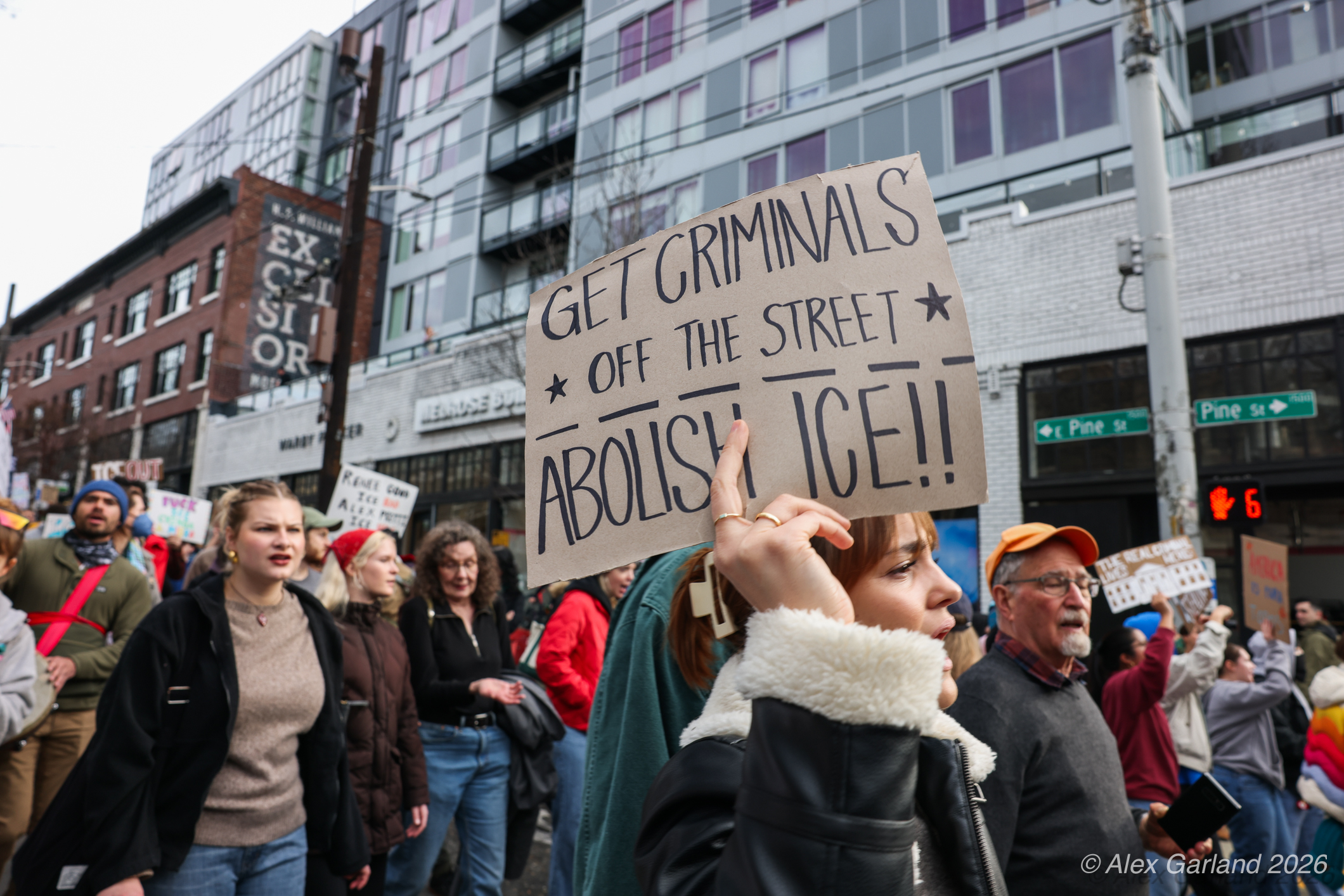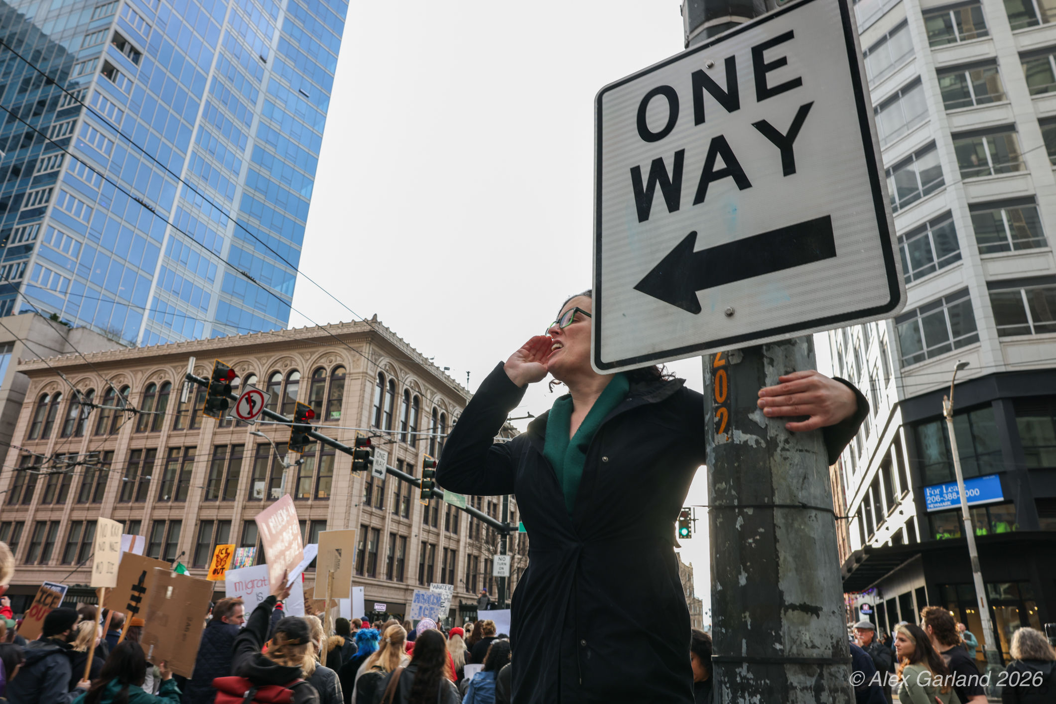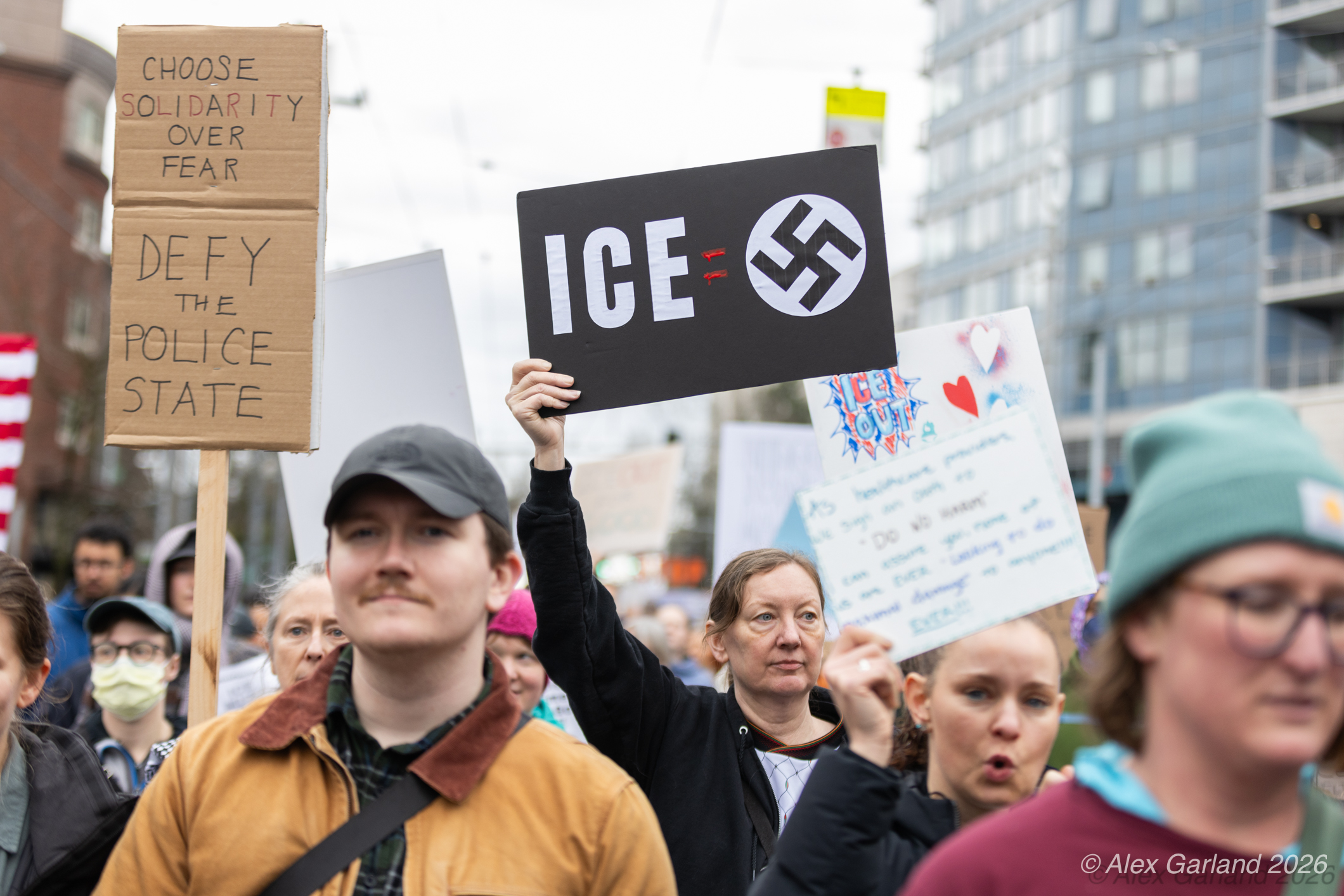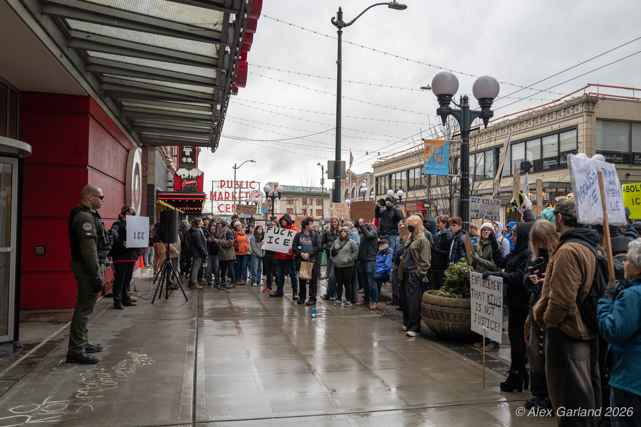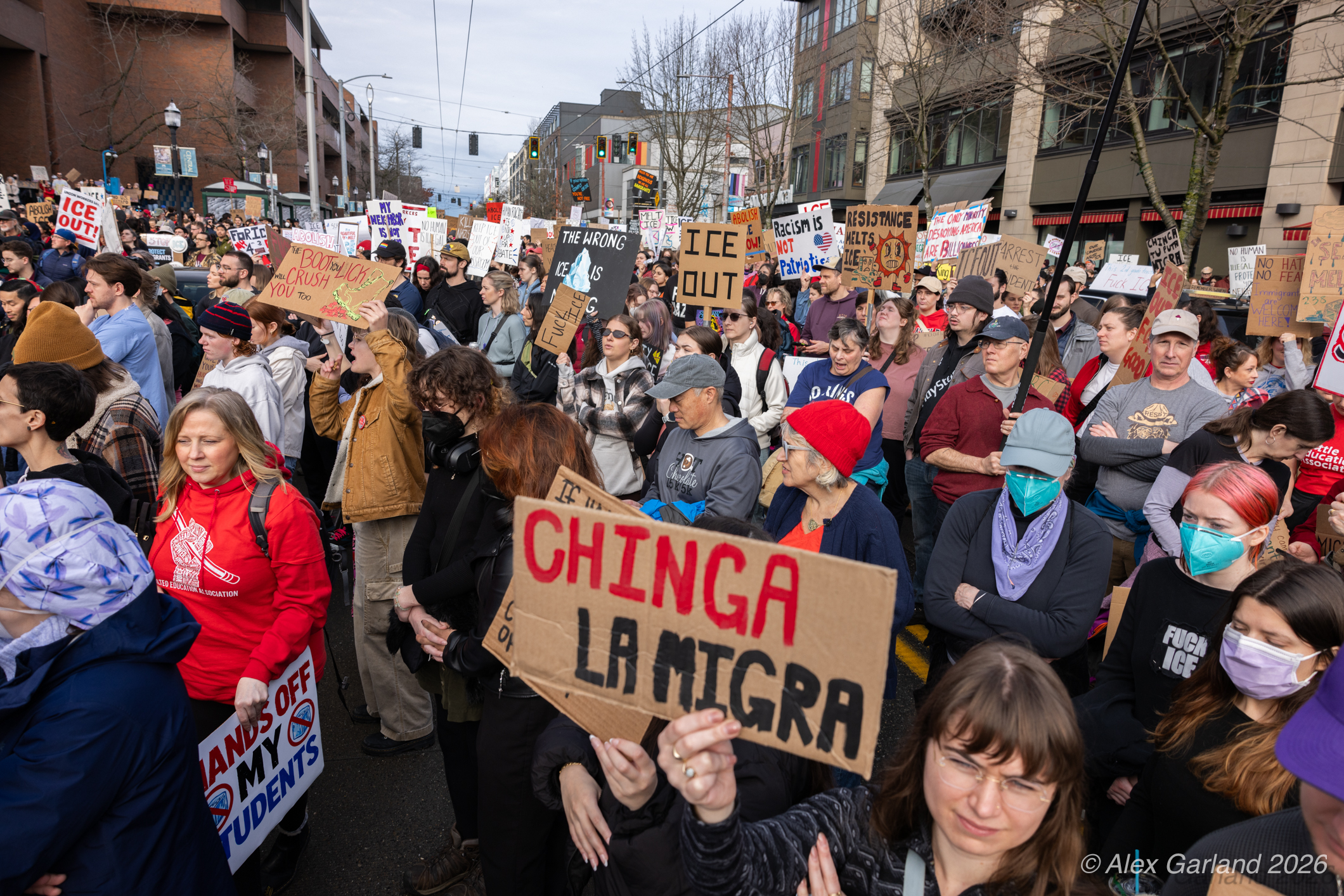 From Seattle Central, the march continued down Pine Street before turning left onto 2nd Avenue and heading into downtown Seattle. The procession moved through the commercial core as participants chanted “No justice, no peace. No ICE in our streets.” Hundreds of demonstrators gradually left the crowd along the route and the march concluded at the Henry M. Jackson Federal Building, where the remaining participants gathered for a short rally.