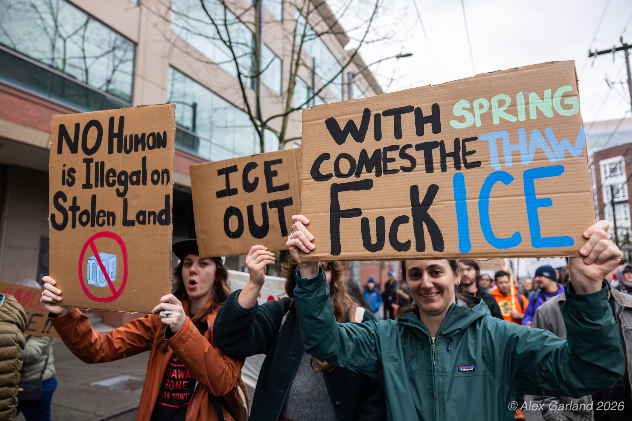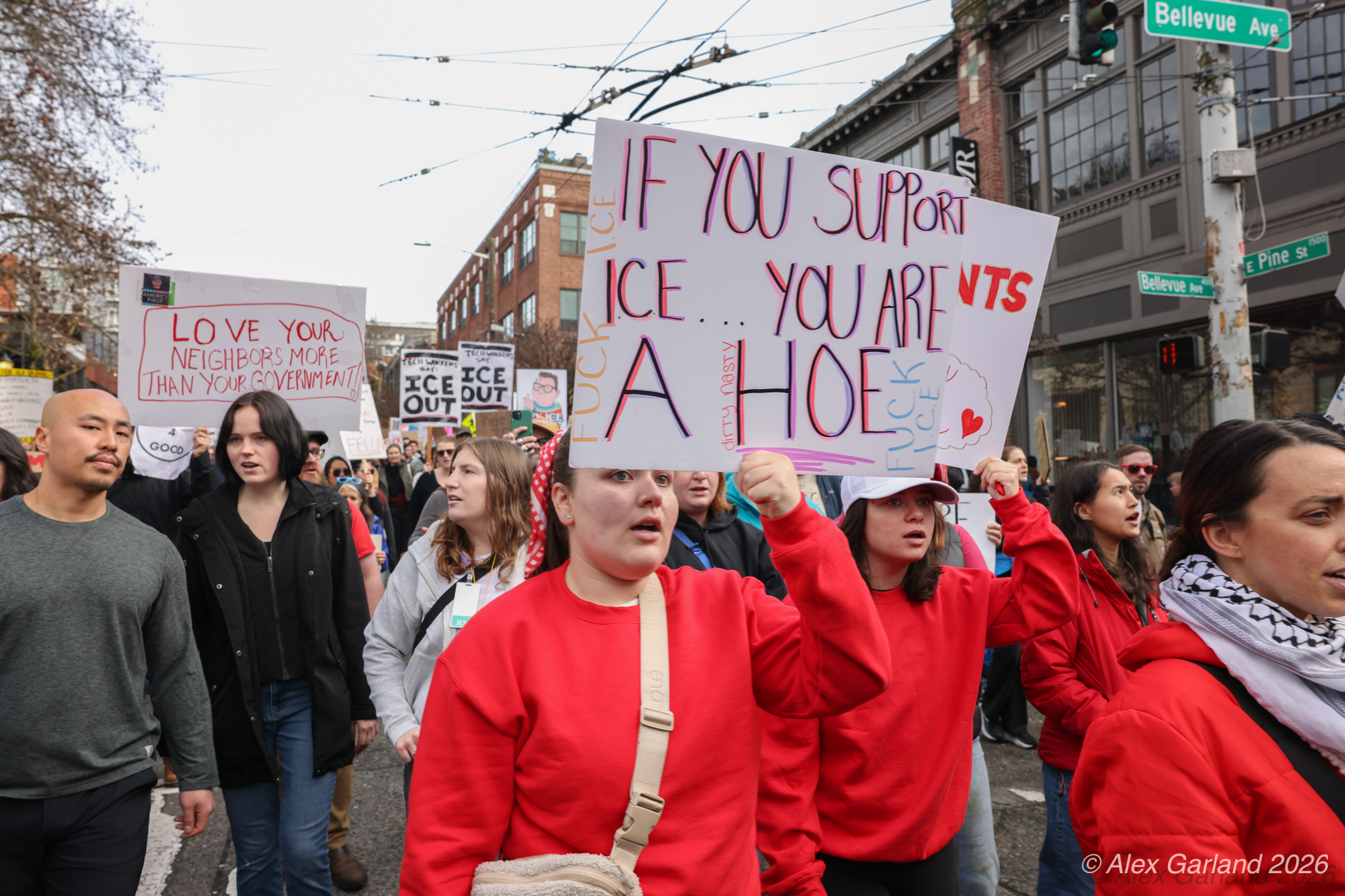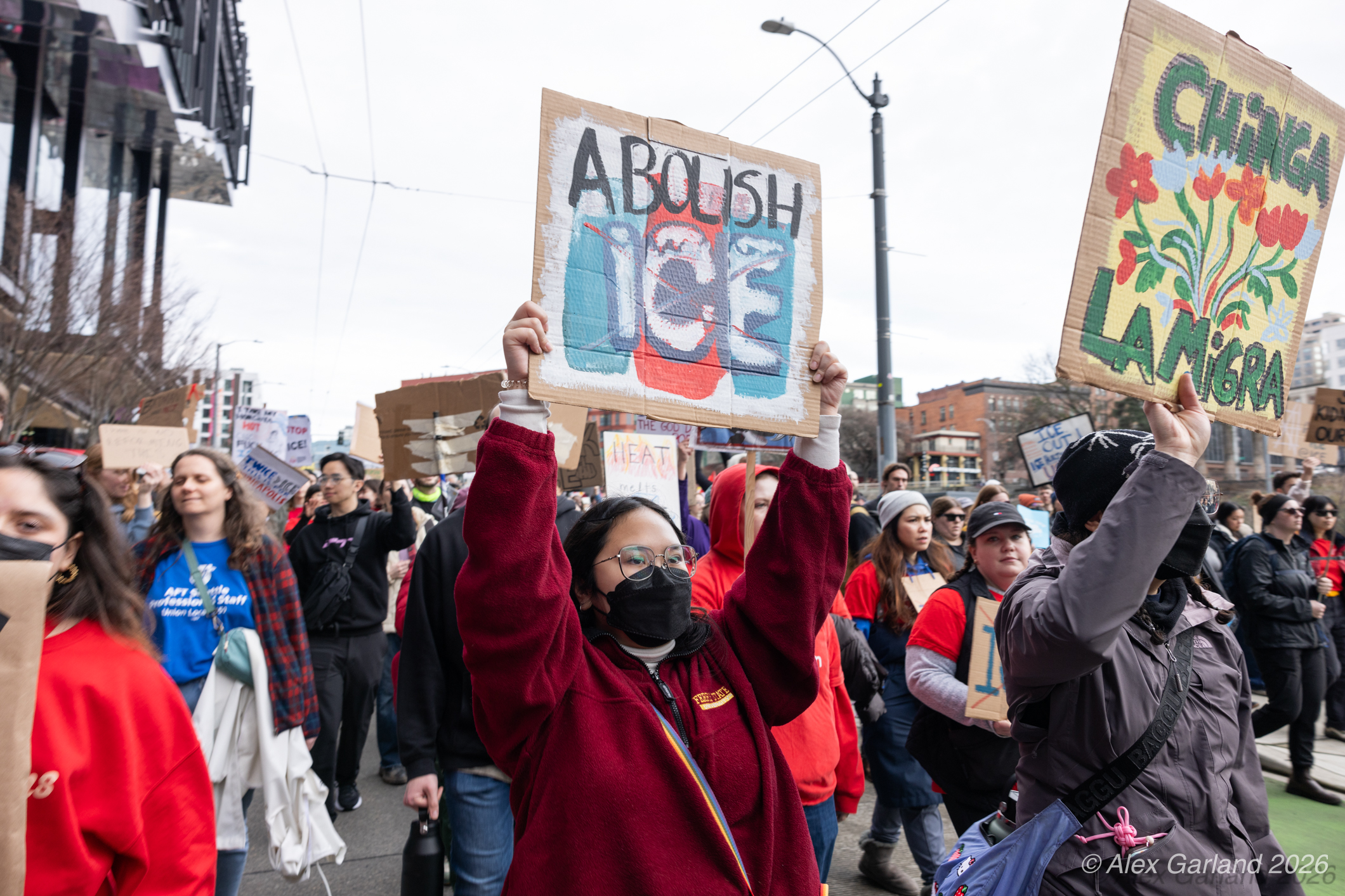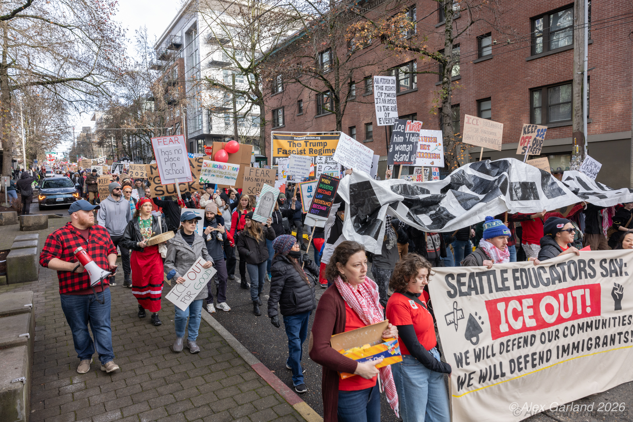 From Seattle Central, the march continued down Pine Street before turning left onto 2nd Avenue and heading into downtown Seattle. The procession moved through the commercial core as participants chanted “No justice, no peace. No ICE in our streets.” Hundreds of demonstrators gradually left the crowd along the route and the march concluded at the Henry M. Jackson Federal Building, where the remaining participants gathered for a short rally.