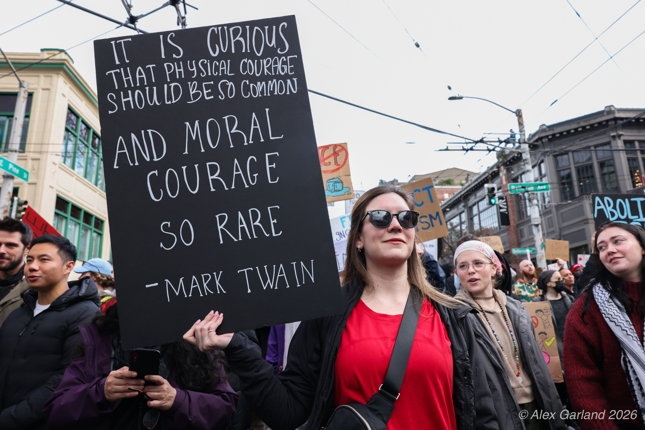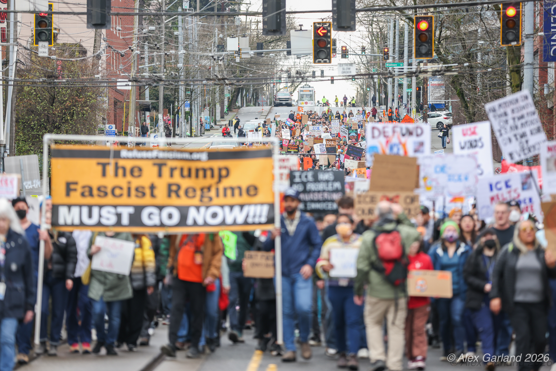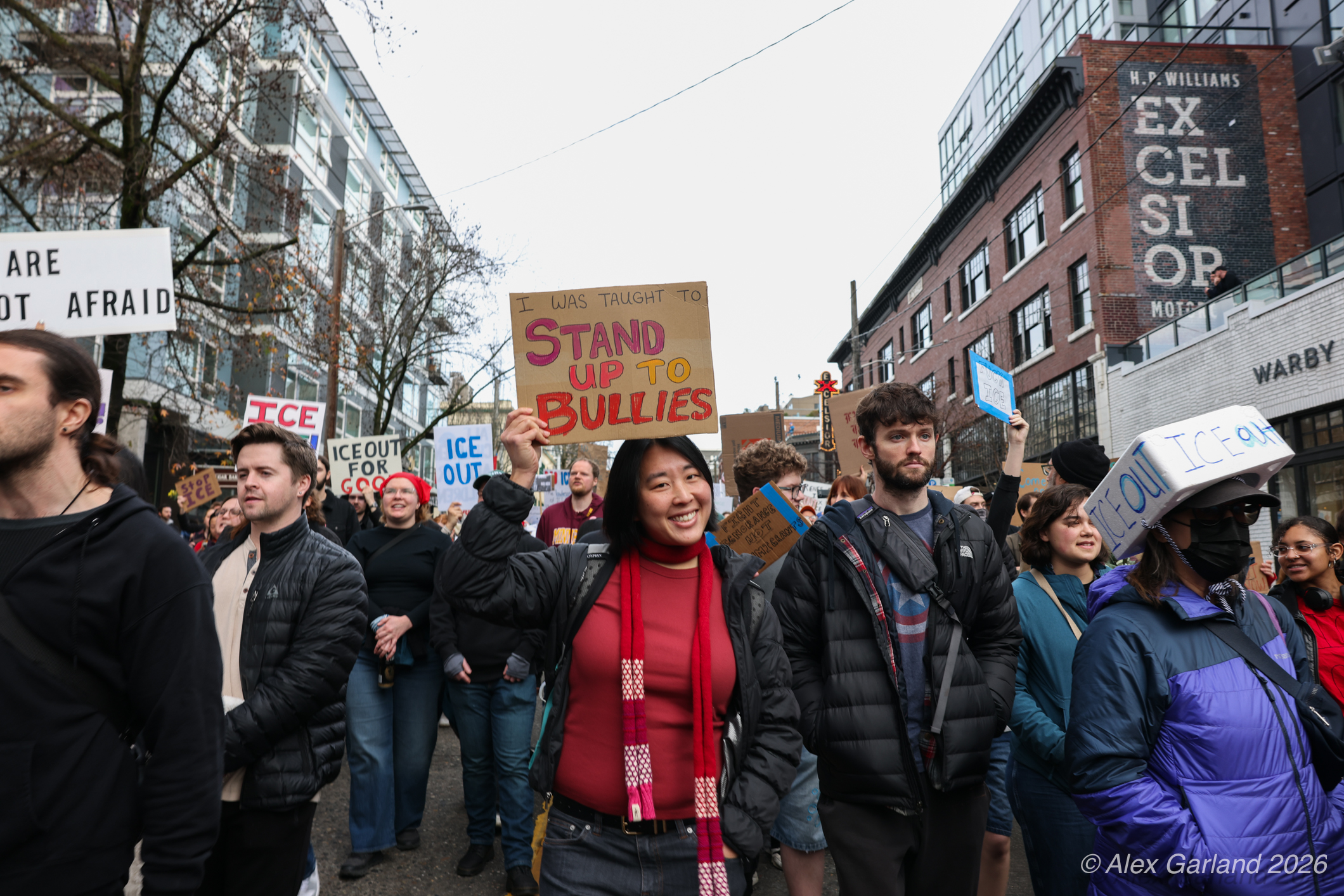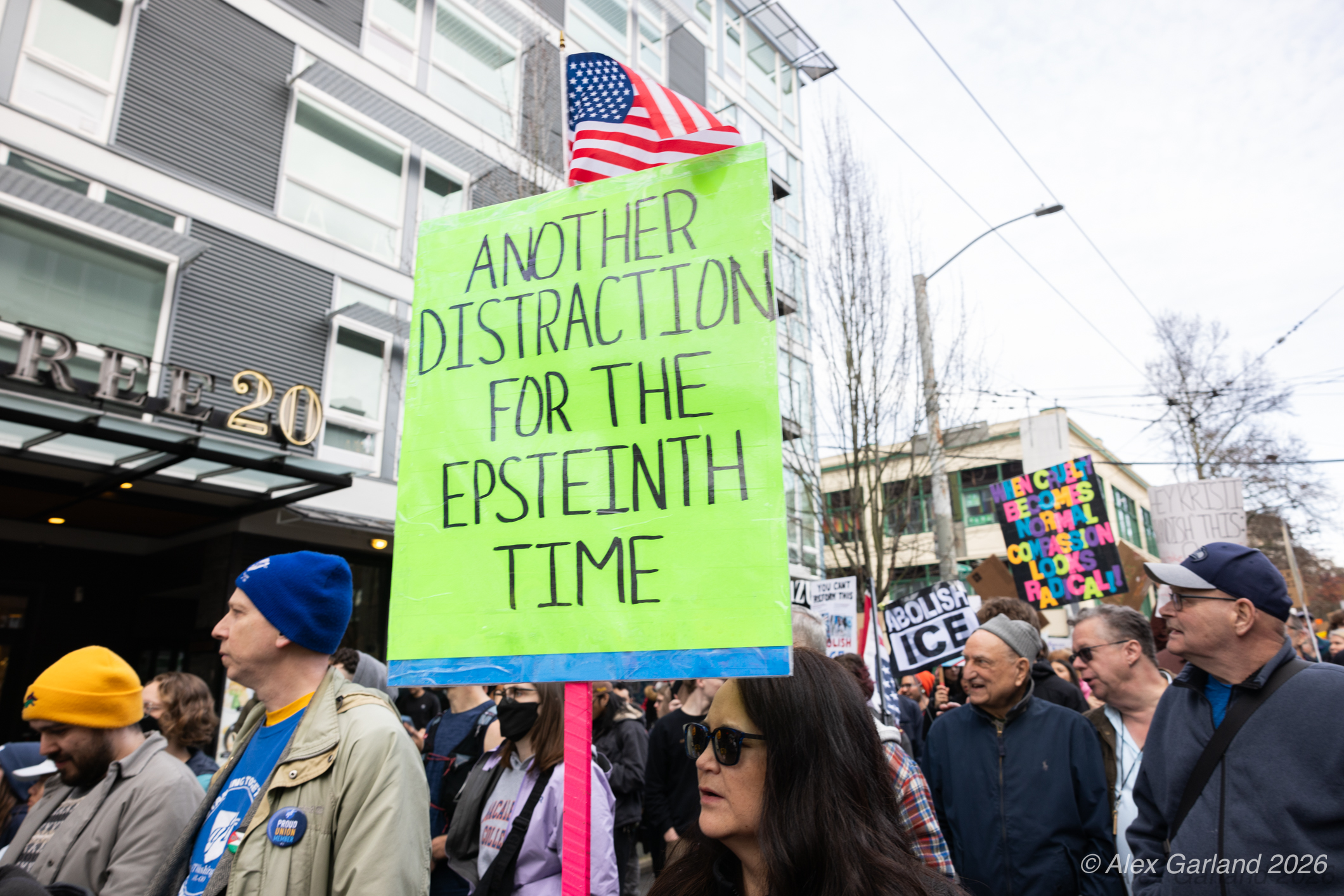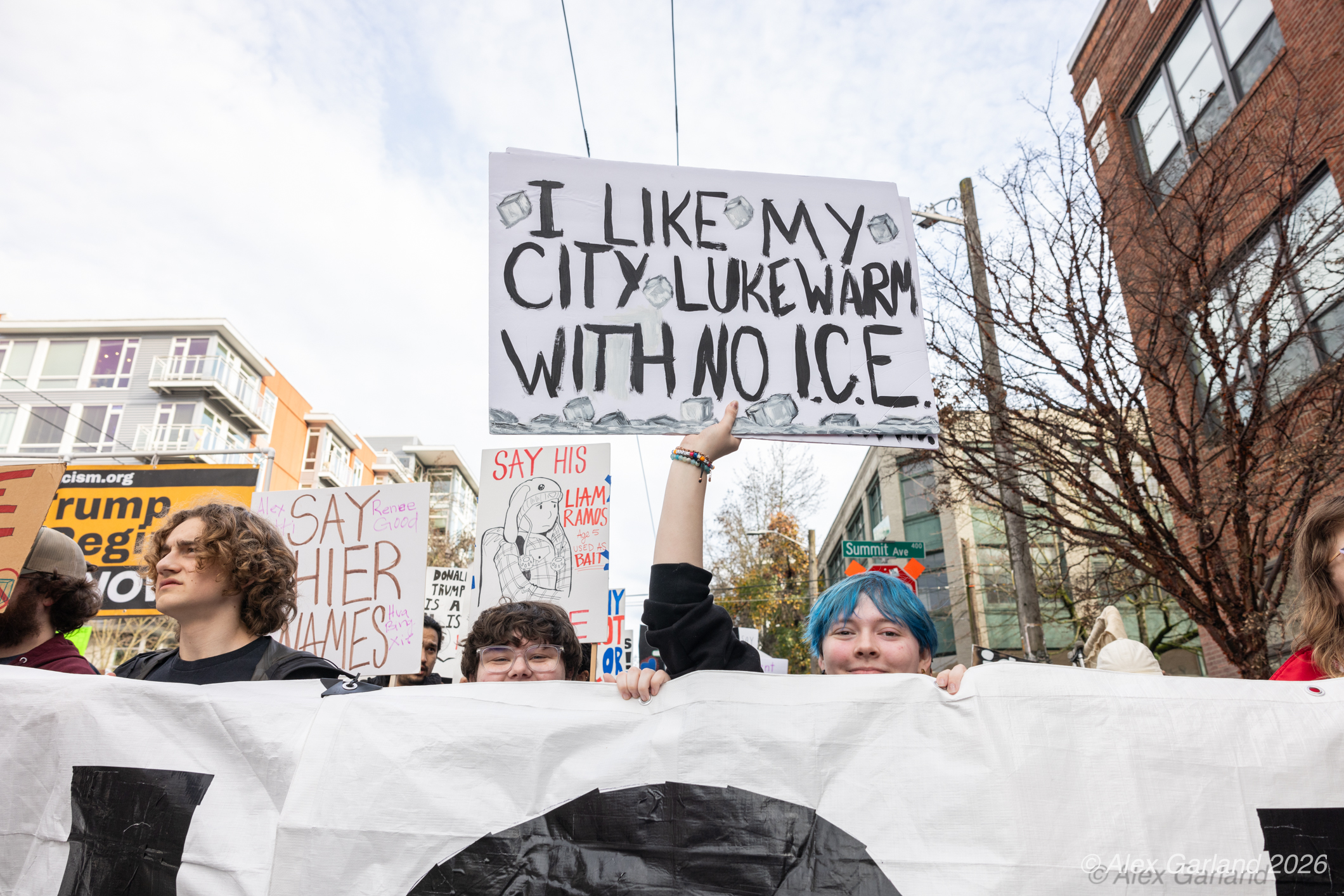 From Seattle Central, the march continued down Pine Street before turning left onto 2nd Avenue and heading into downtown Seattle. The procession moved through the commercial core as participants chanted “No justice, no peace. No ICE in our streets.” Hundreds of demonstrators gradually left the crowd along the route and the march concluded at the Henry M. Jackson Federal Building, where the remaining participants gathered for a short rally.