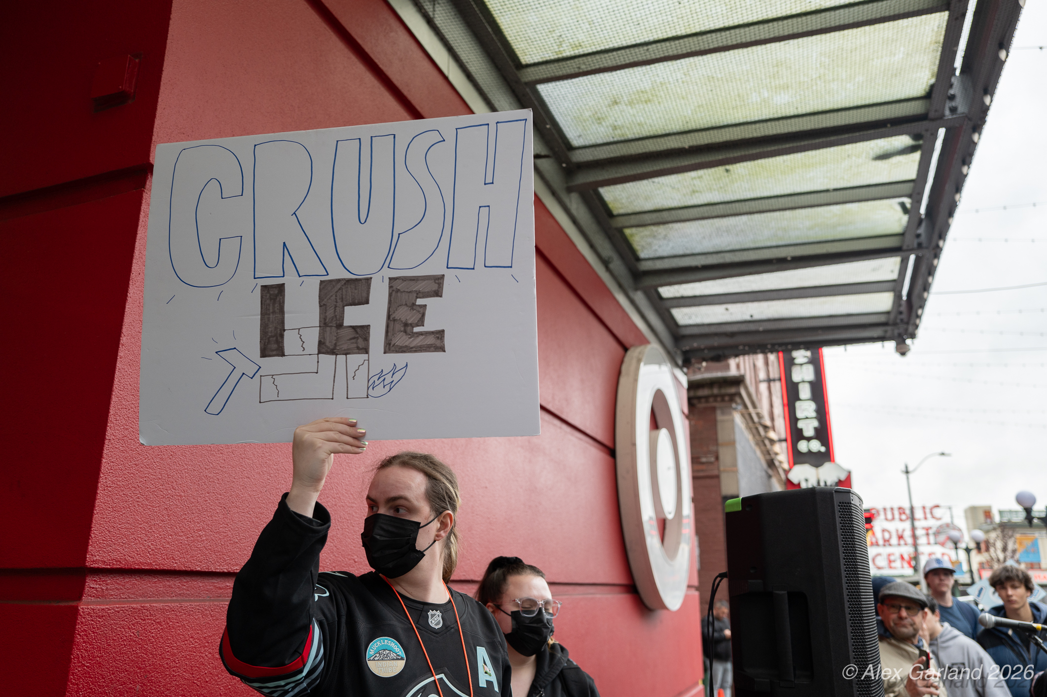 Executive Secretary-Treasurer or Laborers Local 242, Katie Garrow, connected Palantir’s practices to Washington’s labor history, drawing from three generations of family experience in the timber industry. “East Coast elites like Peter Thiel, other oligarchs like Friedrich Weyerhaeuser, owned our forests,” they said, “but my family and thousands of other timber workers over those three generations, fought. They won their unions and they won middle class lives despite incredible odds.”