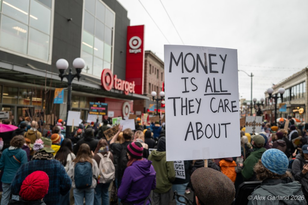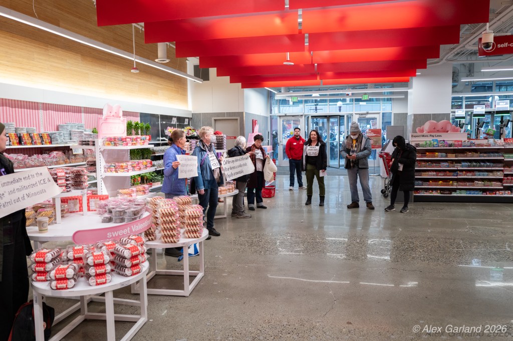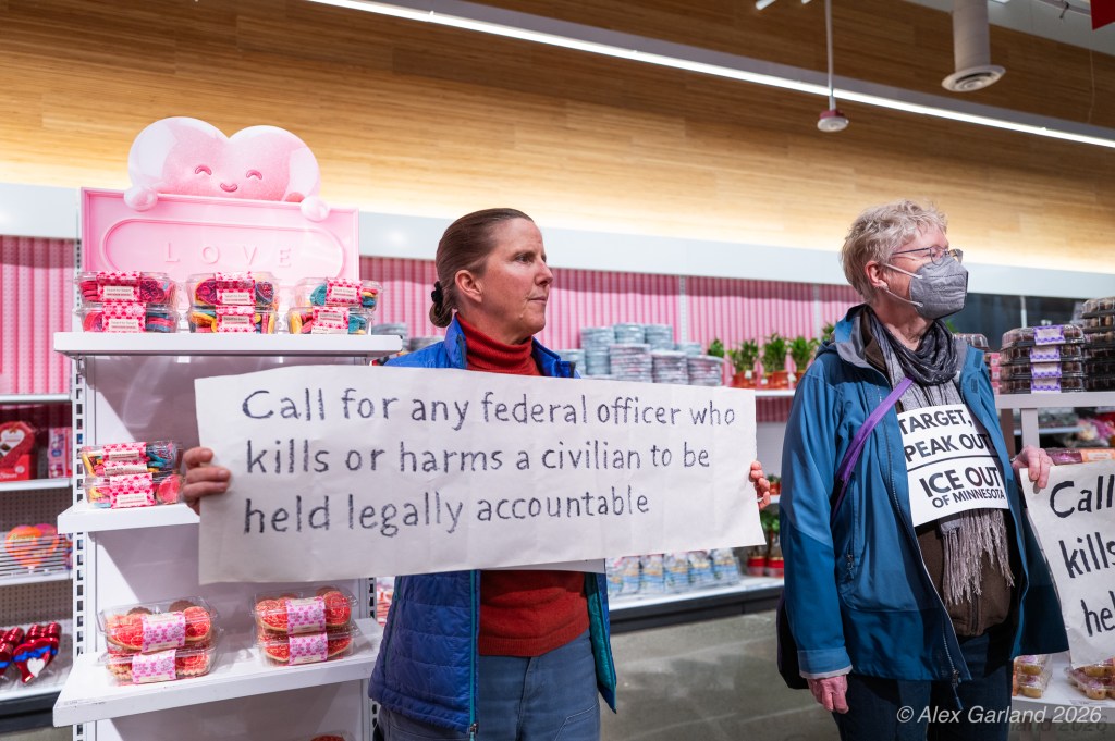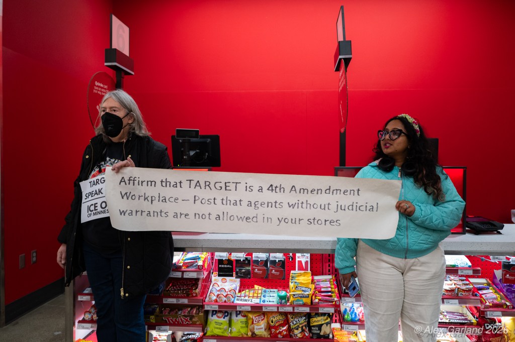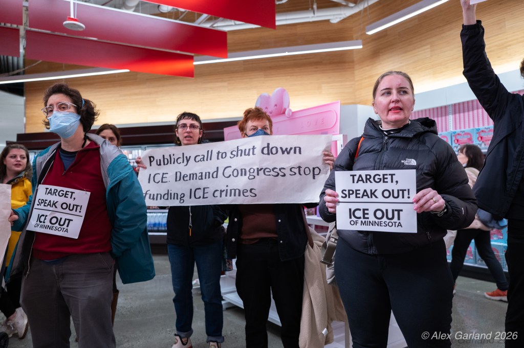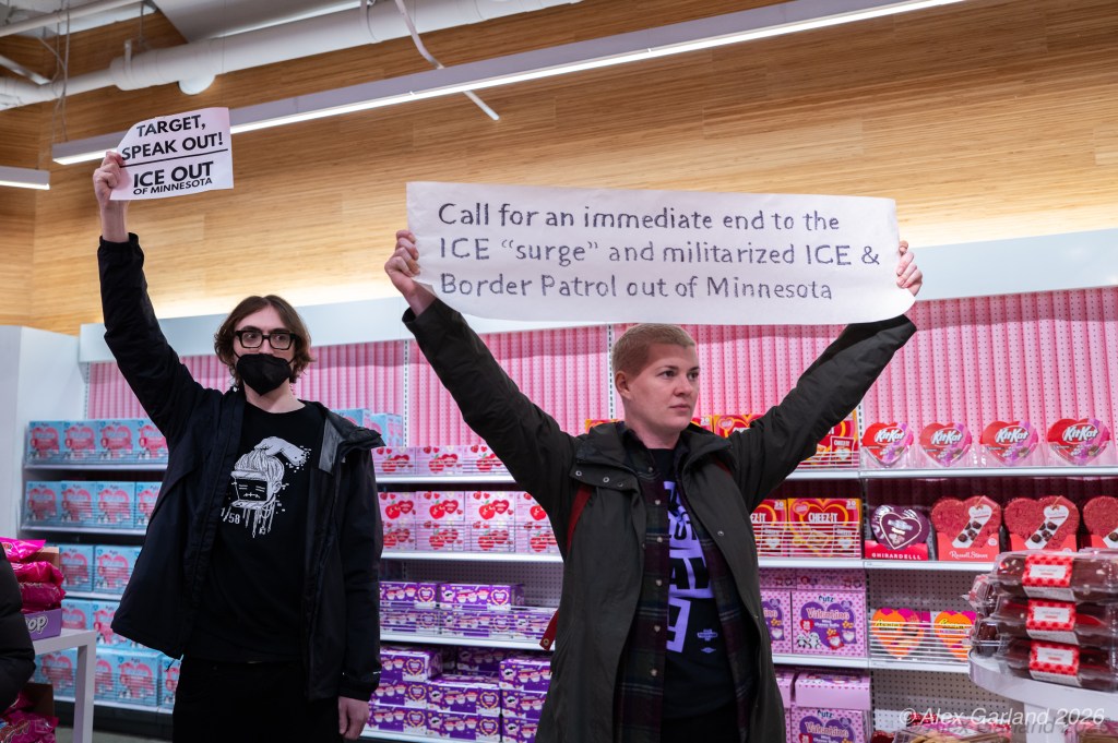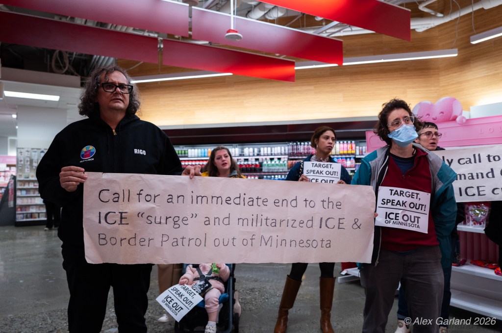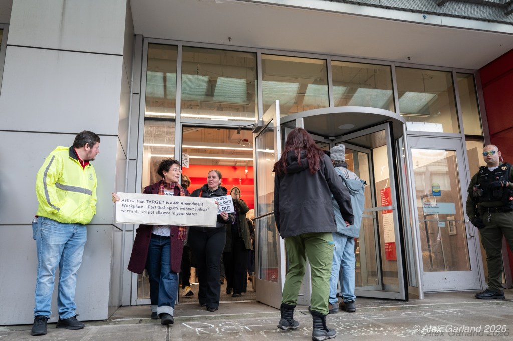 The protest took on more direct action when approximately twenty activists made their way inside the Target location in downtown Seattle itself. Once inside, these demonstrators articulated a series of specific demands regarding the company’s policies and practices. They emphasized that Target, as “Minnesota’s largest corporate citizen”, holds significant influence and responsibility in the communities it serves. While the activists inside the store voiced their grievances and demands to staff and customers, their counterparts amplified the message by carrying and displaying banners that detailed the protesters’ key demands and talking points.