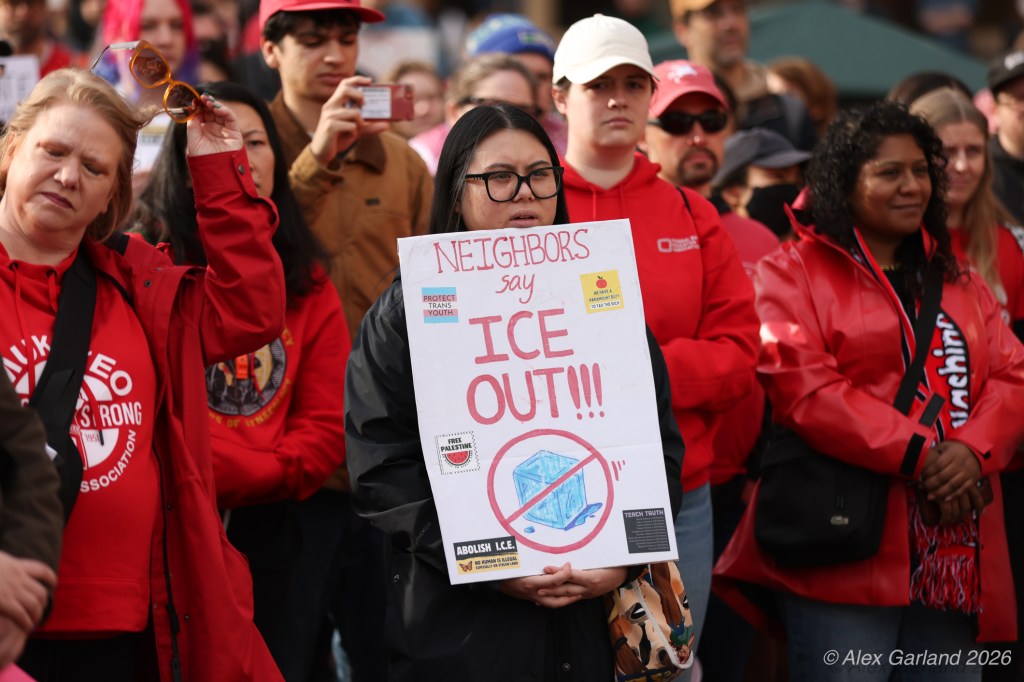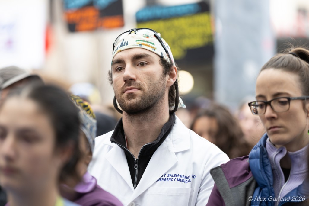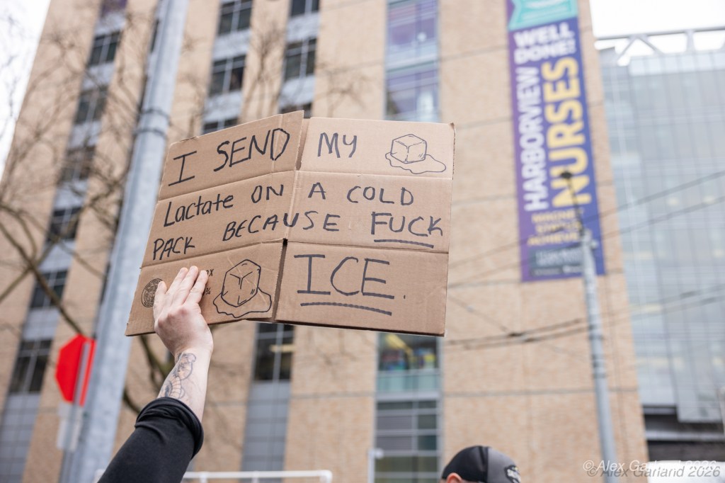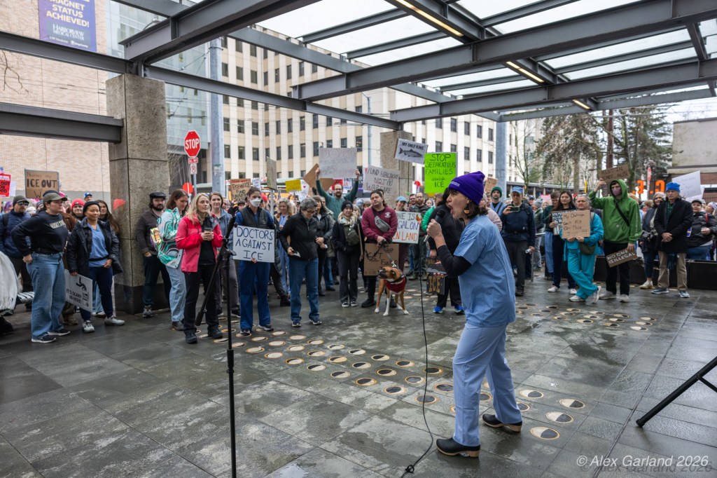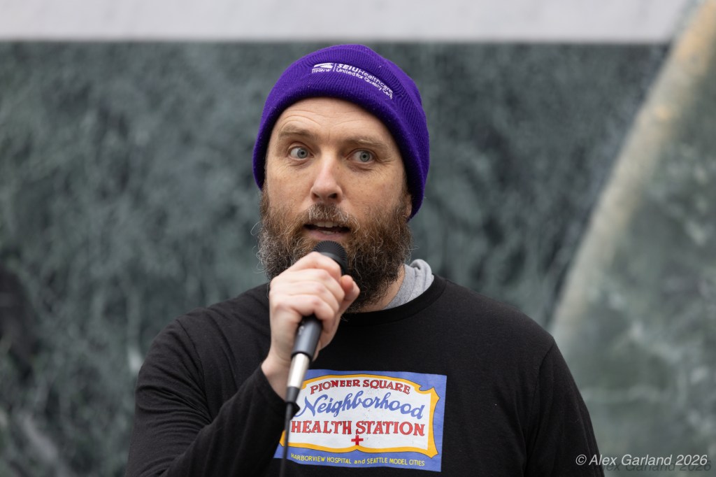 Lucas MacDonald, an advanced registered nurse practitioner with Harborview Mental Health and Addiction Services, spoke to the healthcare workers’ perspective during the rally. “Alex Pretti was one of the best of us. He was a leader in his ICU. He led them through Covid chaos, mentored younger nurses. As a former ICU nurse, I guarantee when the emotions ran high, he remained calm, and he is dead, killed by some gassed up ice goons who, in a panic, pinned a man down and executed him in the street. We can’t stand for this. We have to stand up against this darkness that descends on our country. We can’t let bullies and thugs define what patriotism is. We serve our country too. We put on masks to protect our patients, not to terrorize neighbors. We put on masks to protect our families, not to murder people in the streets.”