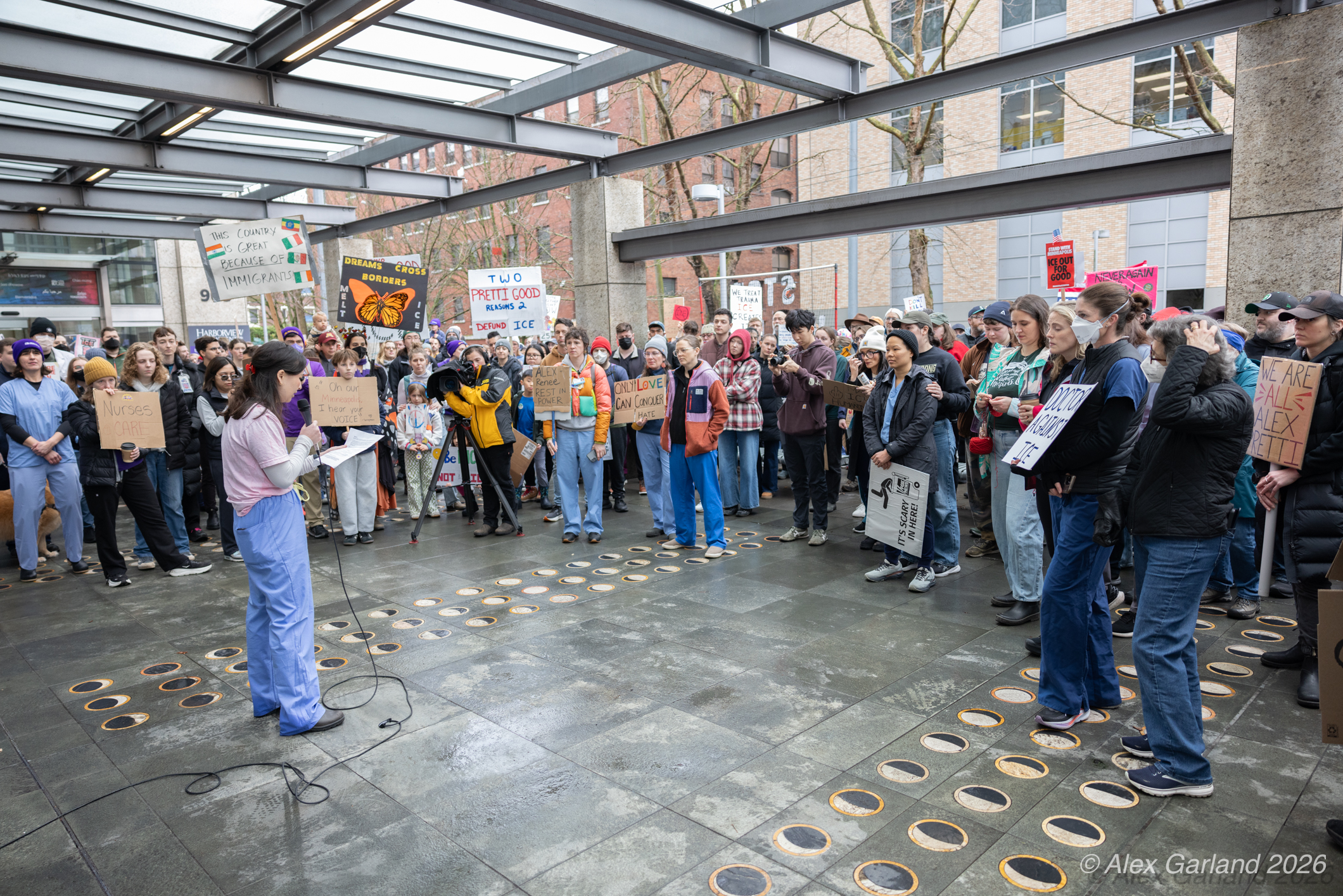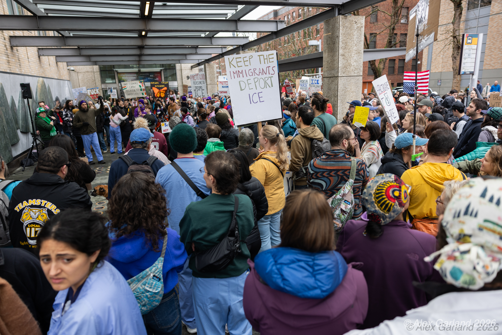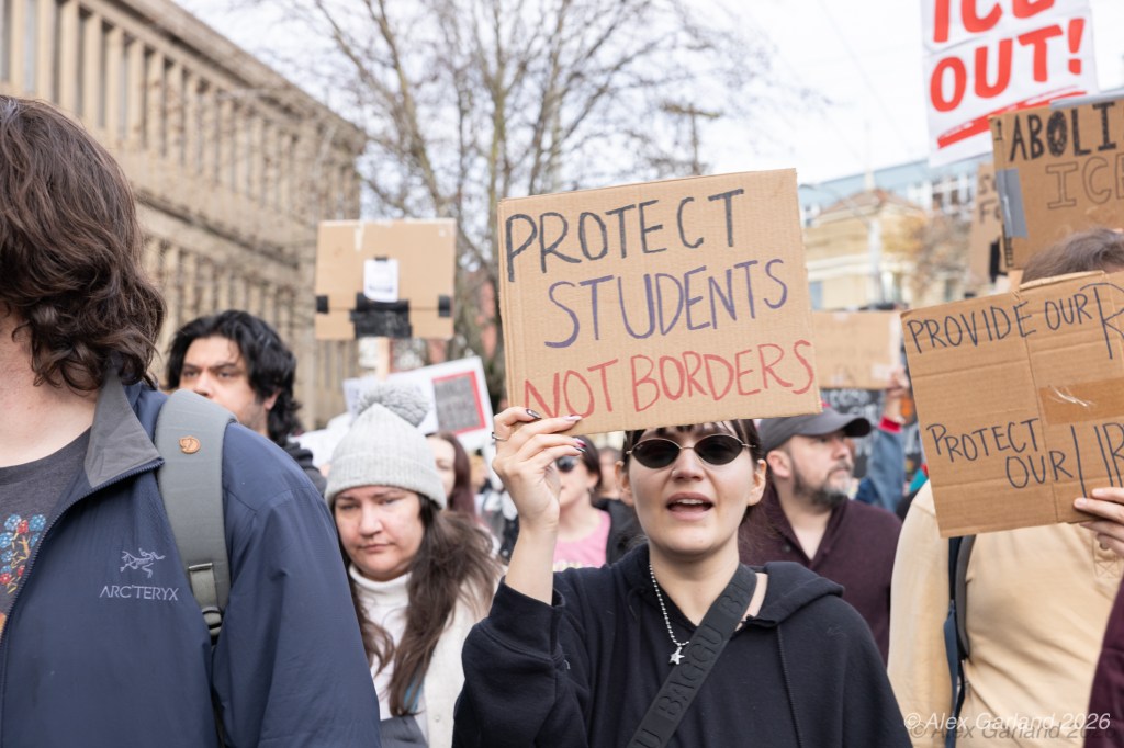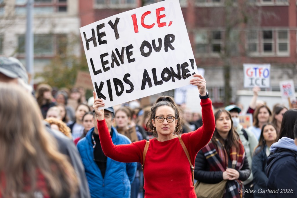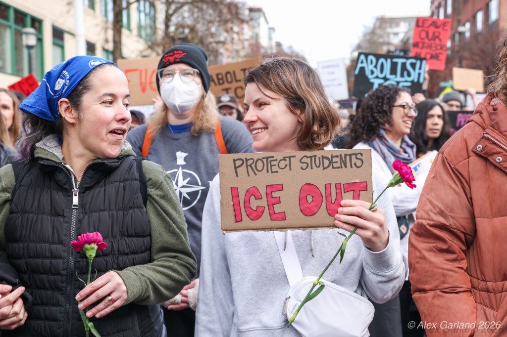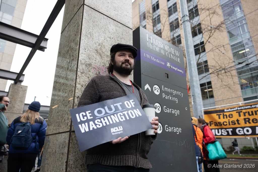 Nearly 1,000 healthcare workers and union supporters gathered at Harborview Medical Center on Sunday before marching north through Capitol Hill. The march drew approximately equal numbers of teachers, activists, and community members at Seattle Central, creating a coalition of public sector workers focused on immigration enforcement and gun violence concerns.