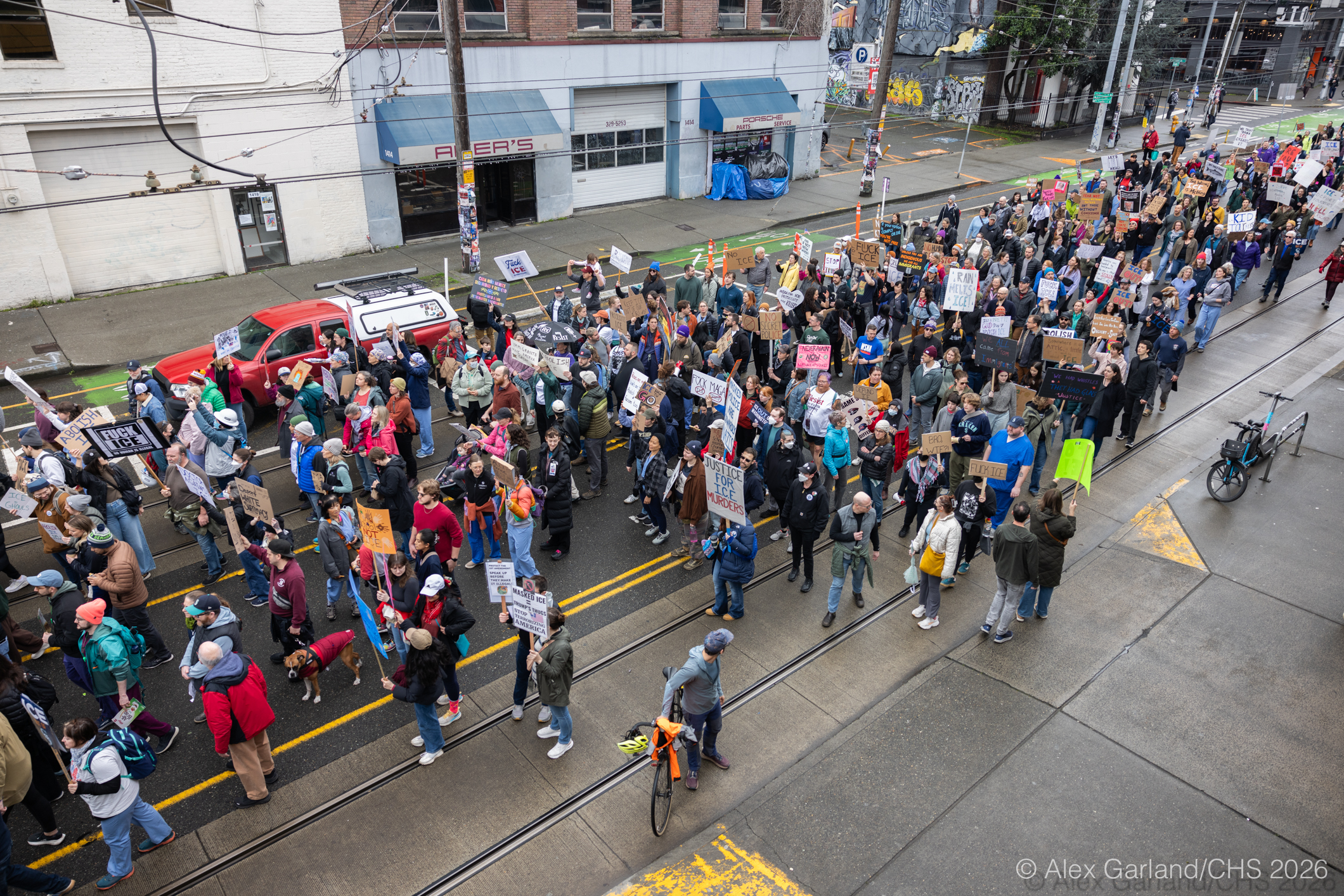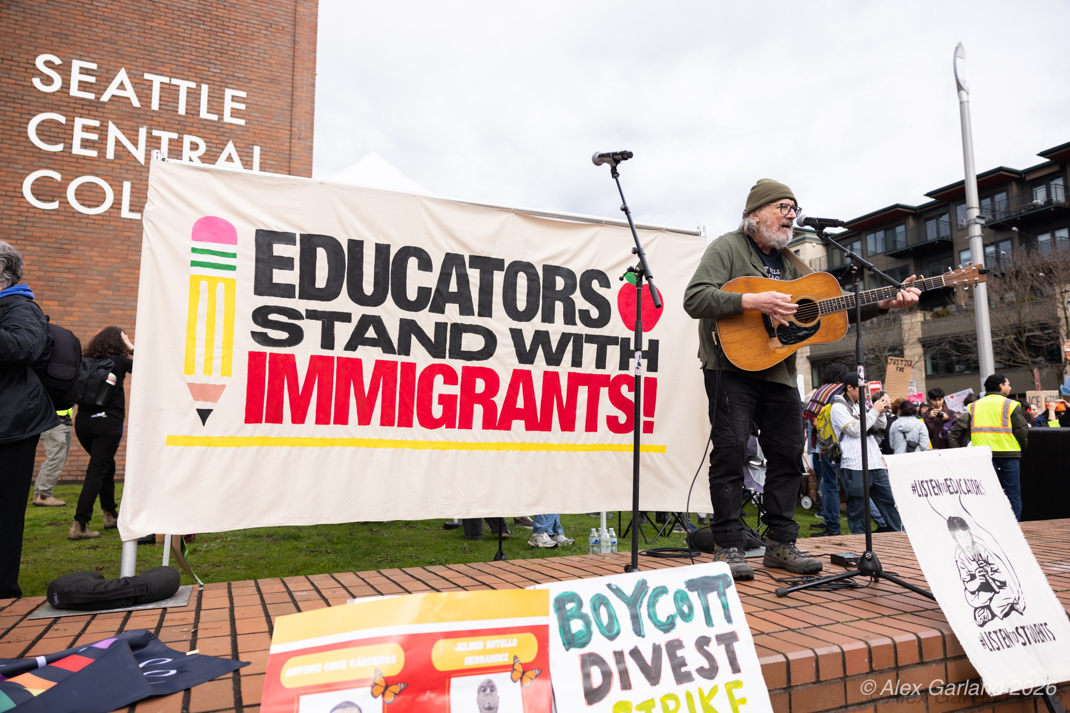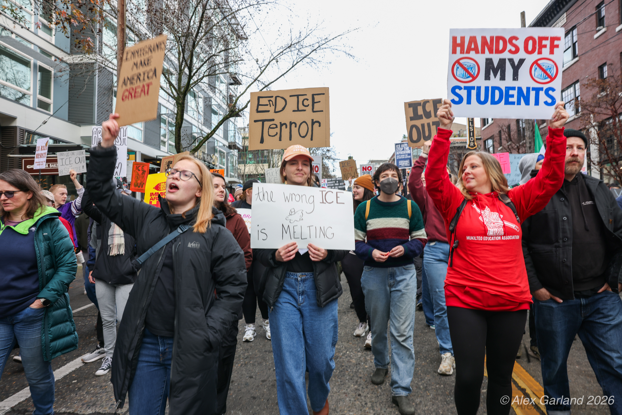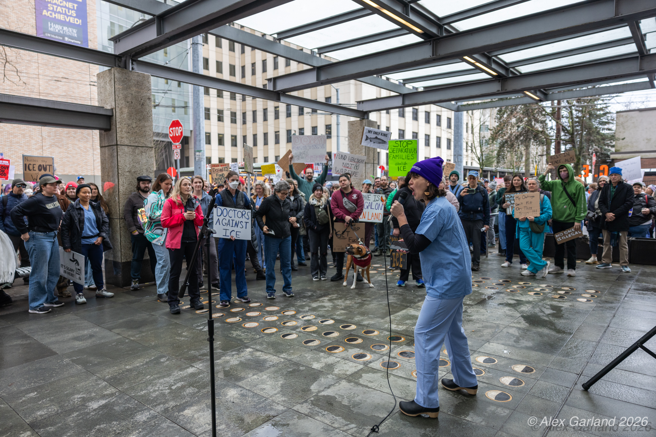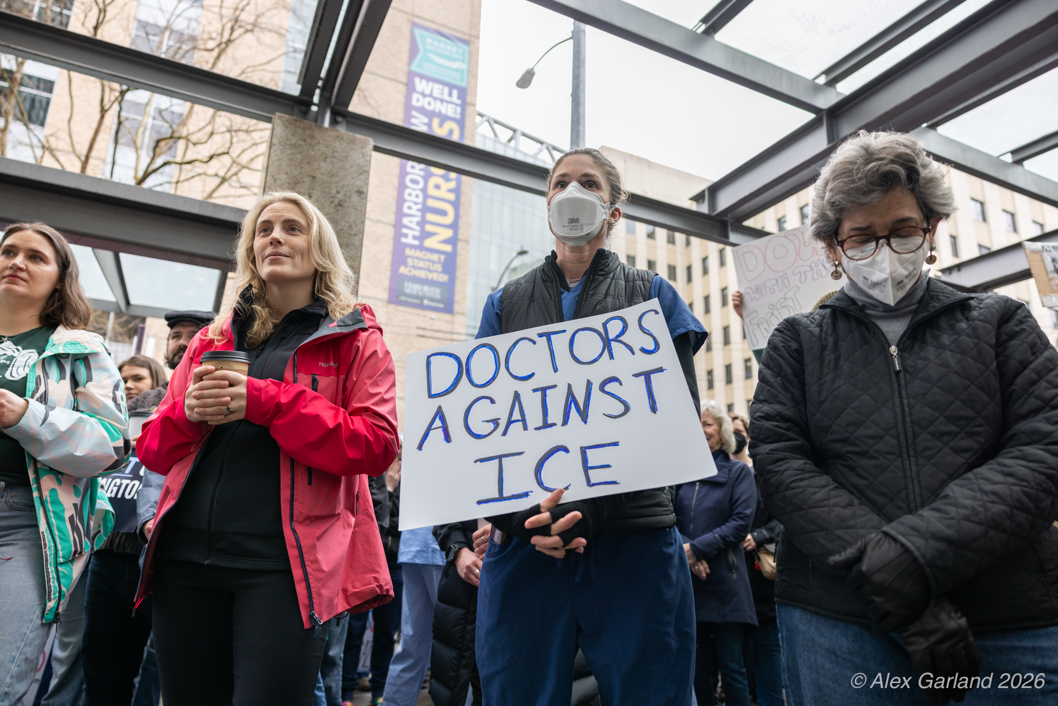 Nearly 1,000 healthcare workers and union supporters gathered at Harborview Medical Center on Sunday before marching north through Capitol Hill. The march drew approximately equal numbers of teachers, activists, and community members at Seattle Central, creating a coalition of public sector workers focused on immigration enforcement and gun violence concerns.