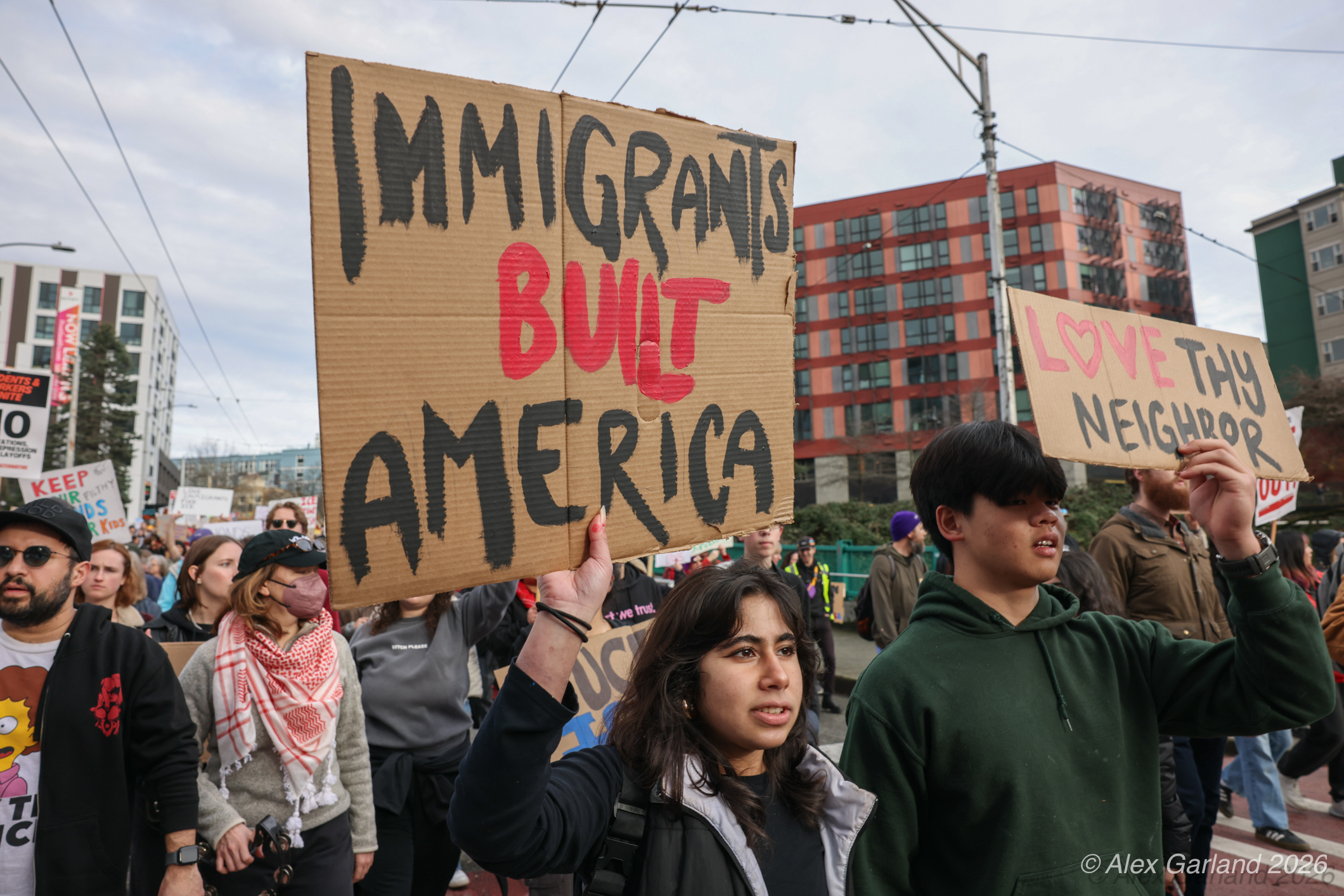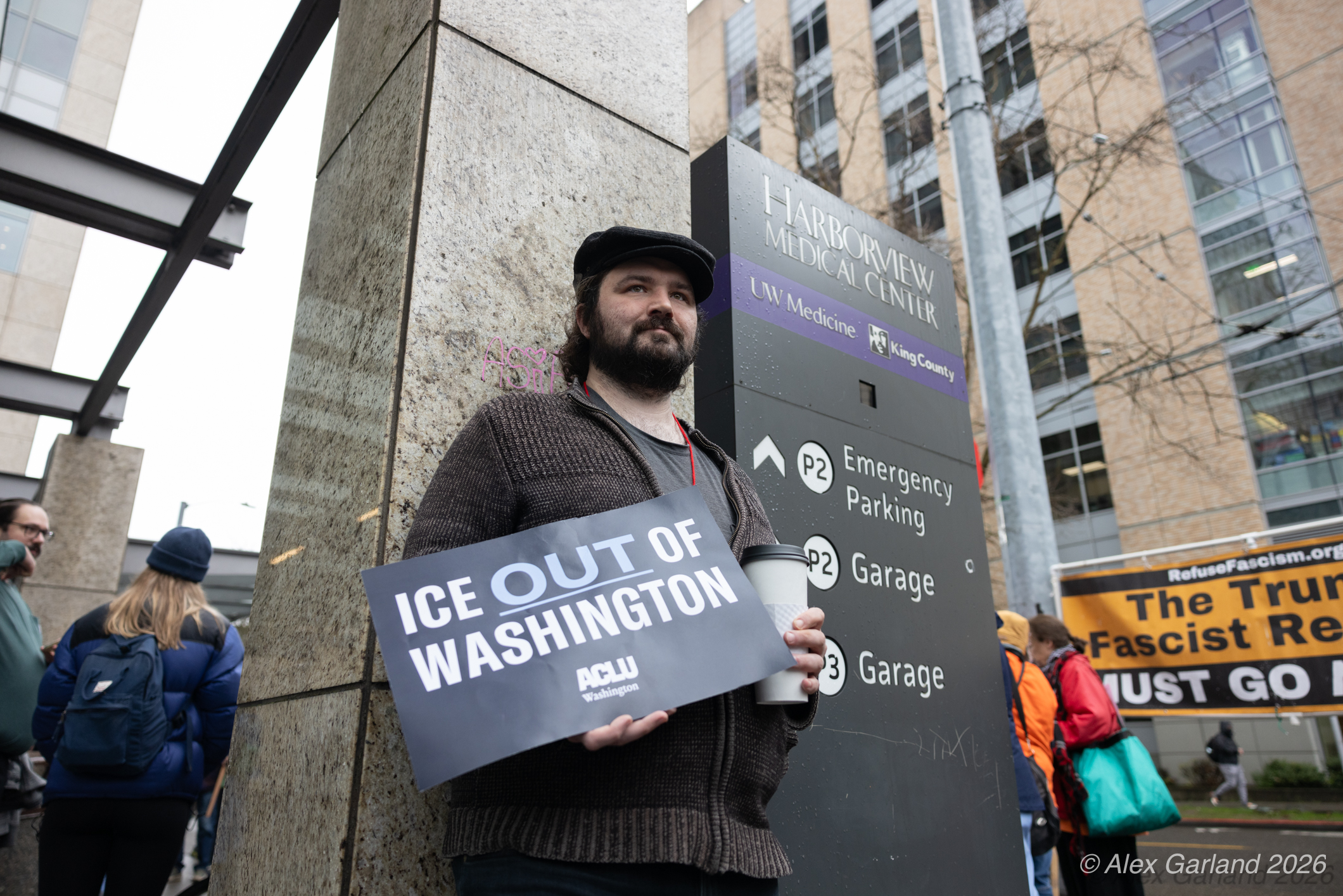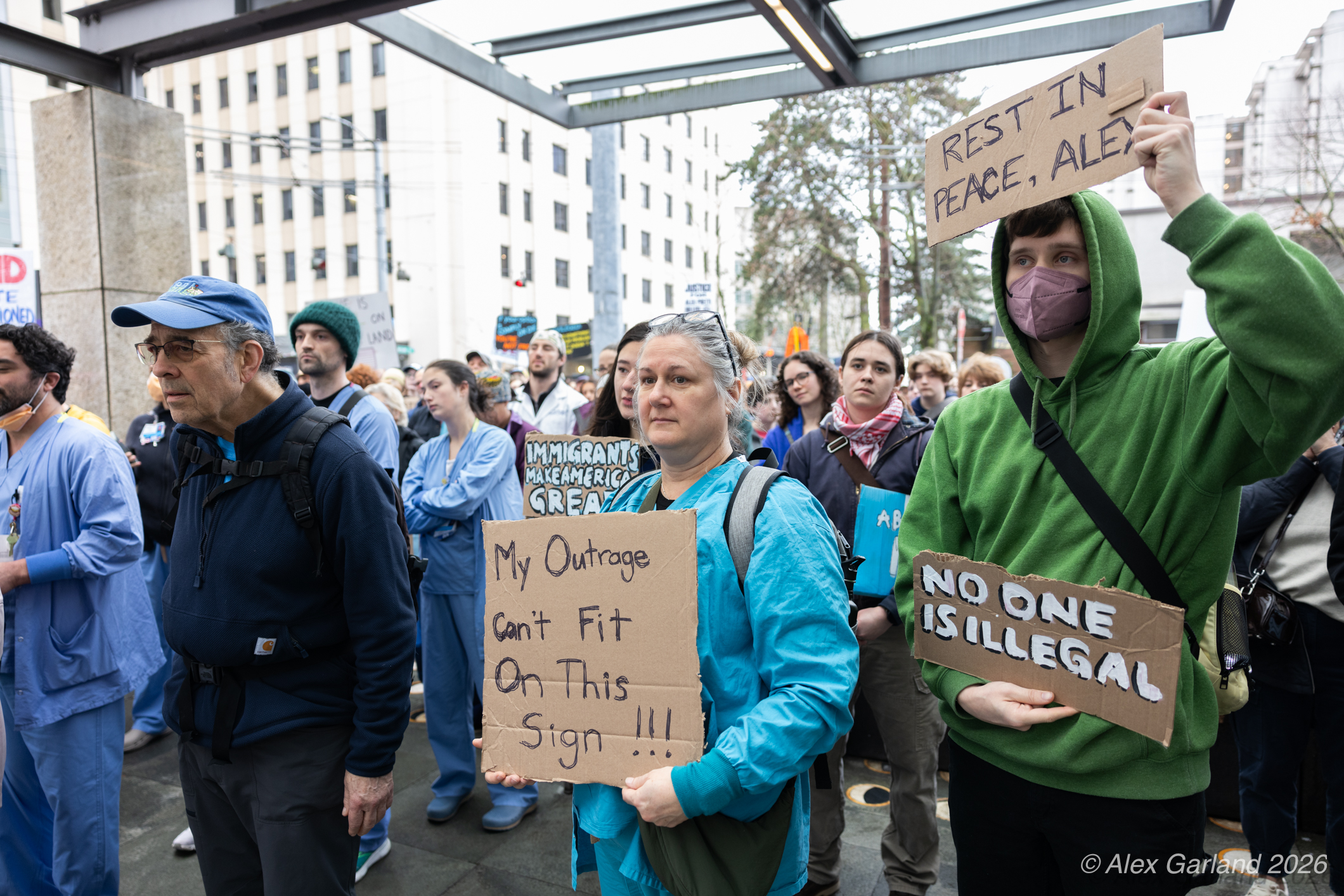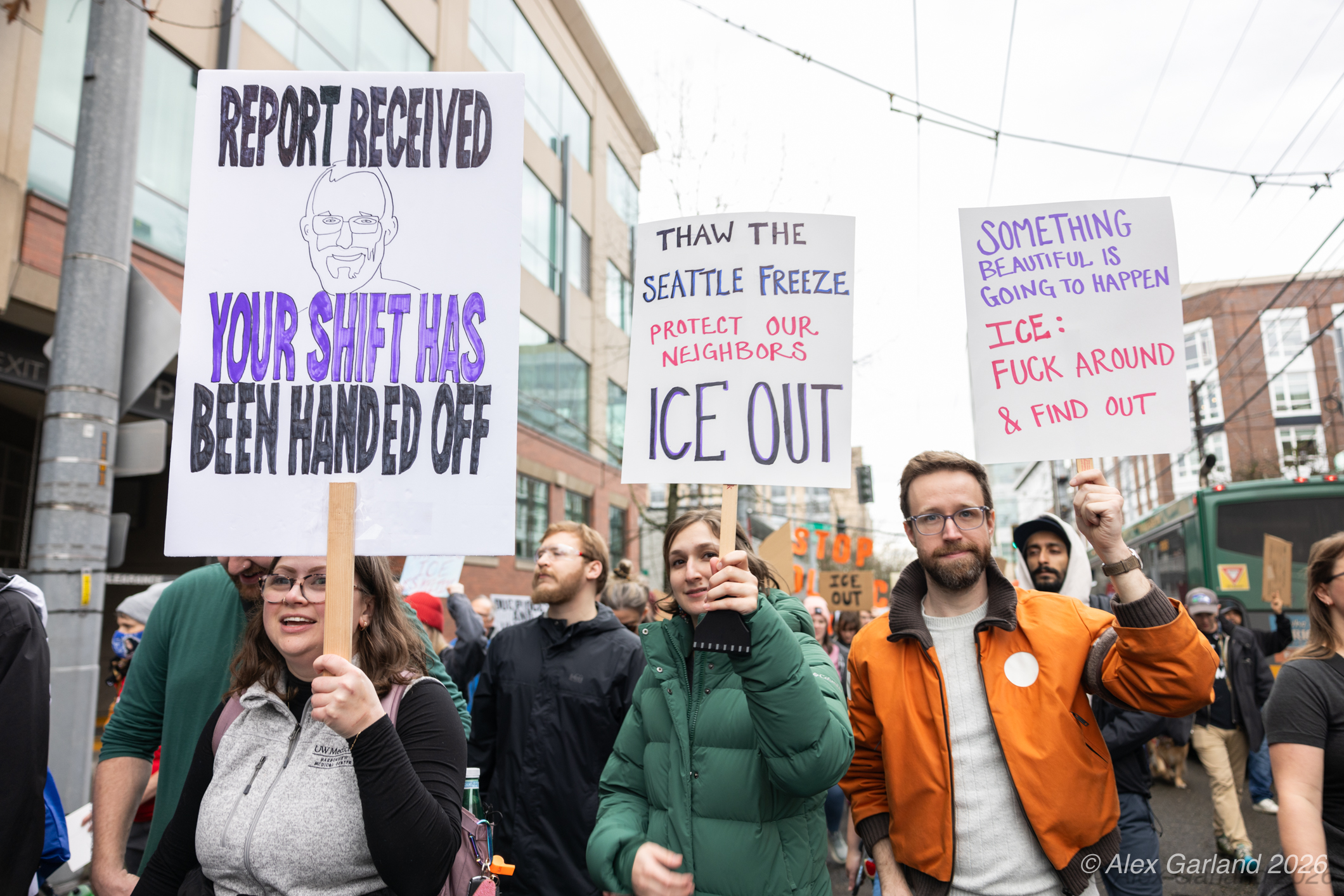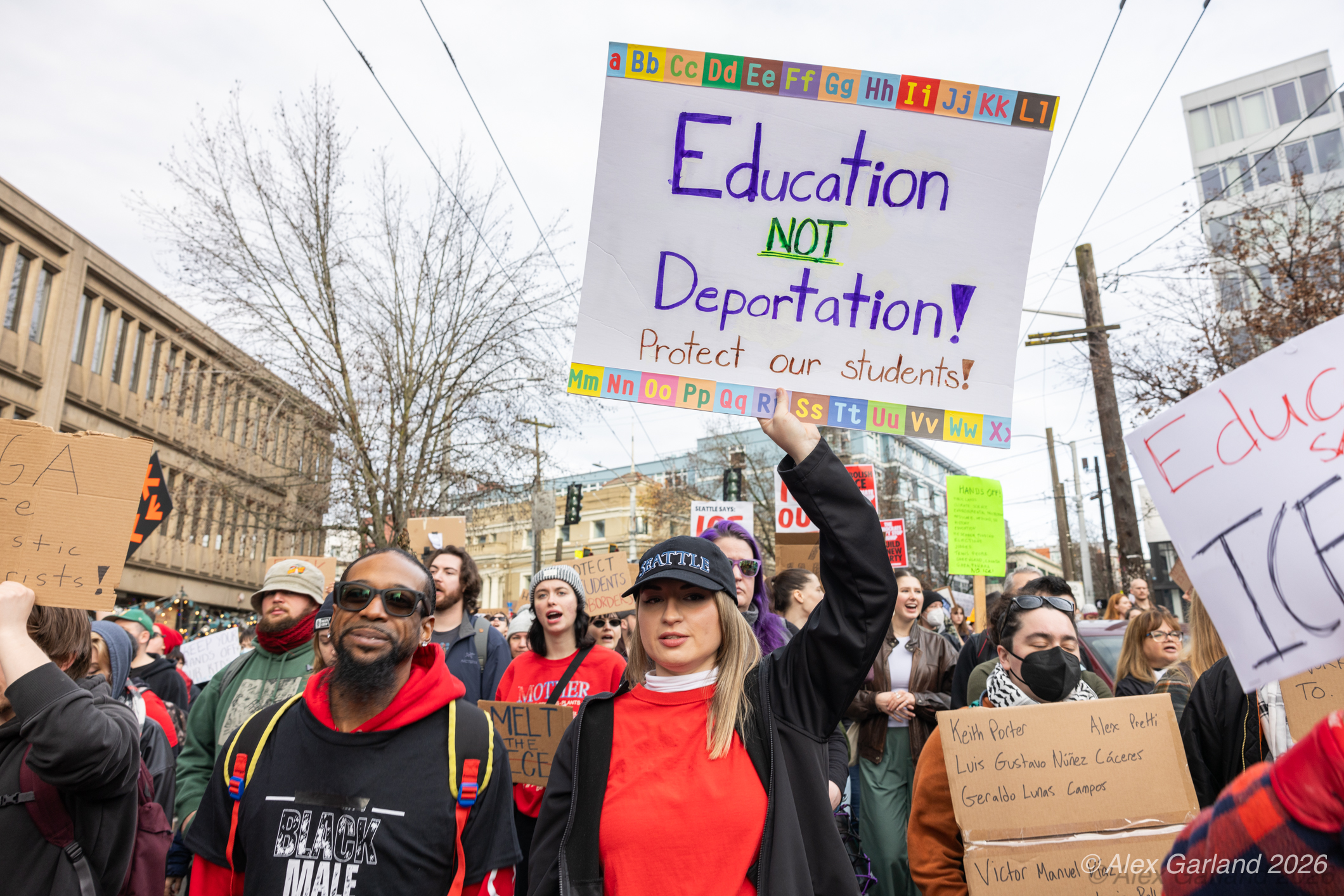 Nearly 1,000 healthcare workers and union supporters gathered at Harborview Medical Center on Sunday before marching north through Capitol Hill. The march drew approximately equal numbers of teachers, activists, and community members at Seattle Central, creating a coalition of public sector workers focused on immigration enforcement and gun violence concerns.