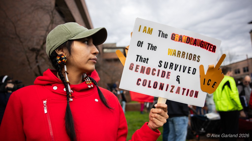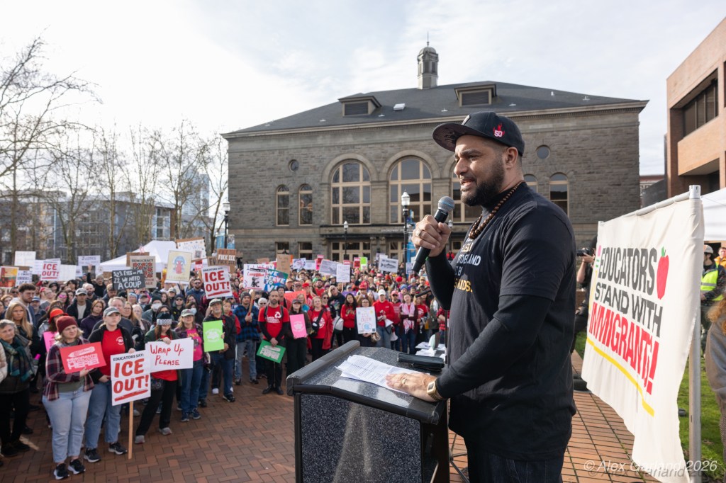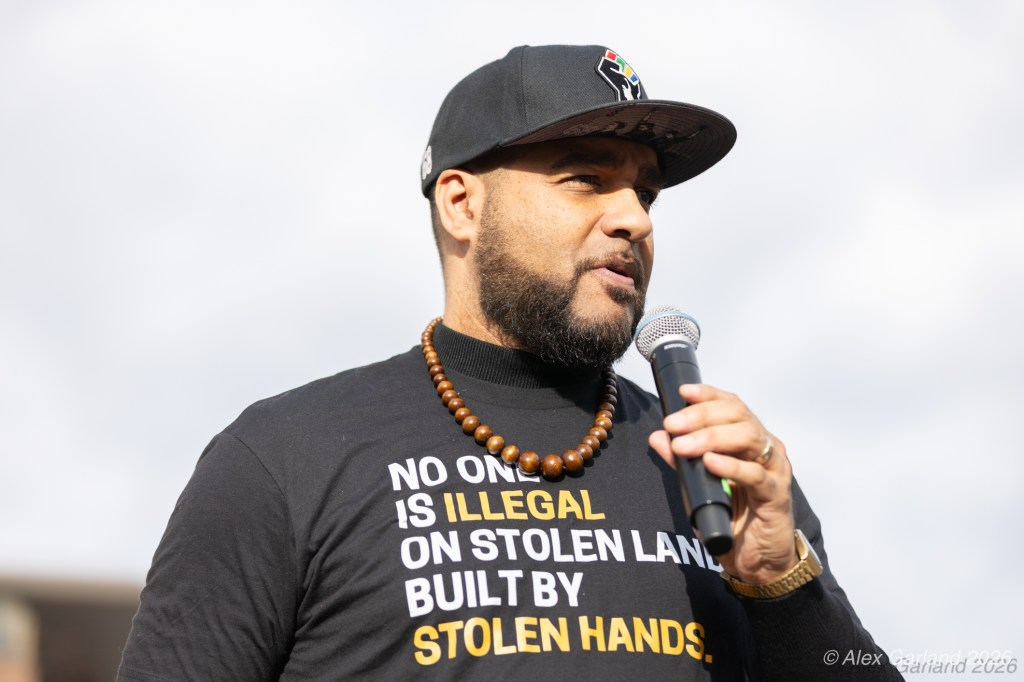 Jesse Hagopian, an educator, writer, and activist, addressed the crowd during the rally. “The world has grown cold and frost is spreading even throughout the places that are supposed to be there to nurture and support our kids and to shelter them, like our schools,” Hagopian said. “In a time when schools can be turned into perilous border crossing areas, when learning is paused by the threat of immigration raids, we are forced to confront a truth that we can no longer deny, that winter is no longer just coming. Winter is already here. The winter for democracy, the winter for justice, the winter for compassion, the winter for the vulnerable, the winter for truth is here. It is winter in America, and we are rapidly confronting an ice age.” He continued: “Yet as sudden as this cold frost is felt around the country, the violence of state repression did not just suddenly appear.”