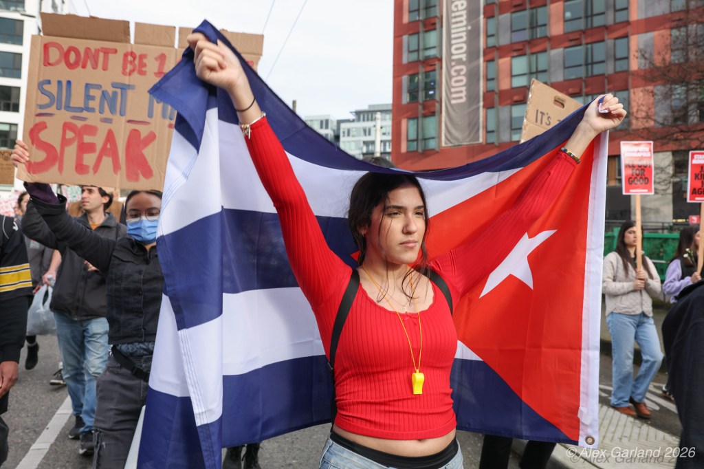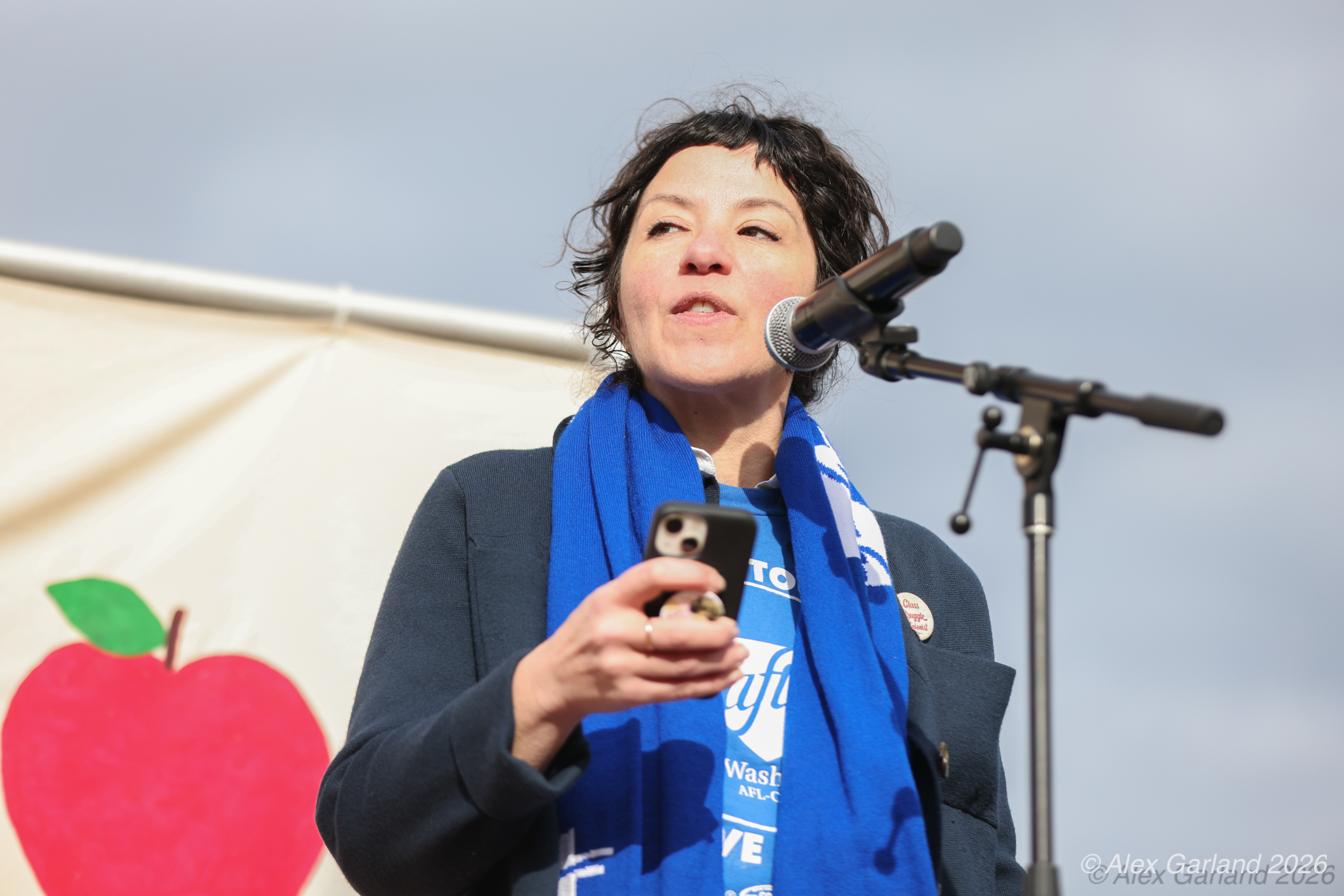 “We’re seeing billionaires grabbing everything they possibly can, leaving working-class and poor people to scramble for the crumbs,” said Kimela Vigil, a mental health practitioner and vice president of the Harborview Union. She linked the $4.5 trillion in proposed cuts to a broader agenda: “The dismantling of the legal system, attacking education systems, using the military to suppress free speech, all of those are the perfect formula for authoritarianism and fascism… We are in it right now… Our role is to resist, to not be complacent.”