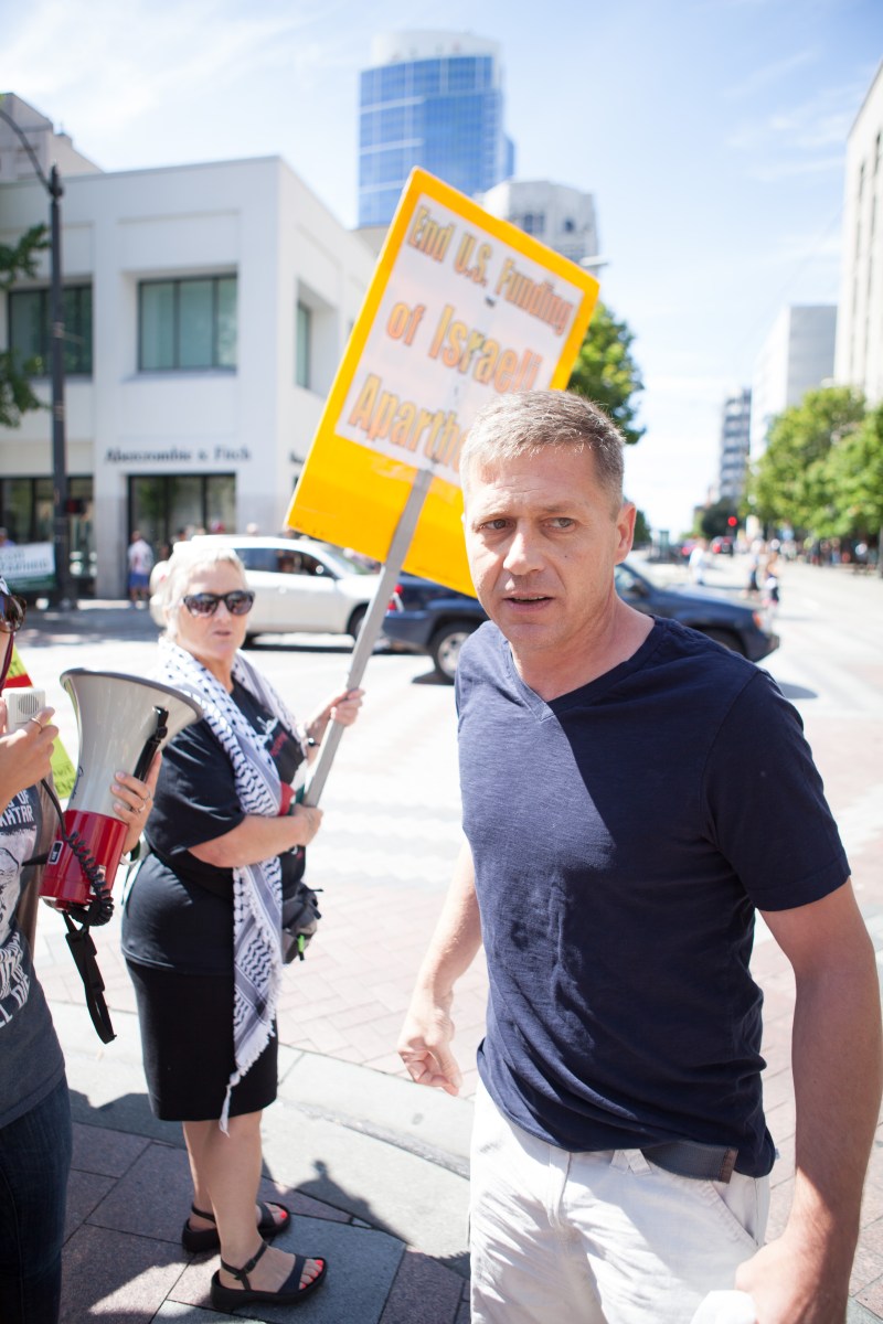 IMG_2852 Published August 14, 2014 at 3744 × 5616 in Activists Protest Bombing of Gaza and innocent passerby harassed by pro Israel opposition and arrested ← Previous Next →