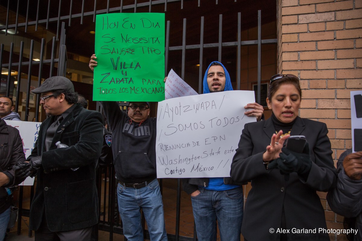 IMG_9672 Published November 21, 2014 at 5472 × 3648 in Hundreds protest the disappearance of of 43 students during a demonstration outside the Mexican Consulate in Seattle, WA ← Previous Next →