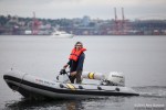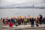 Native canoe families led the flotilla to the mouth of the Duwamish River, where ring of small watercraft was formed outside the 100 yard safety zone and activists chanted and sang songs of protest, as a large banner was unfurled and floated across the mouth of the river in front of the rig. The floating protestors formed around the Indigenous canoes to hear speakers discuss the threats facing native communities due to climate change.