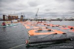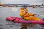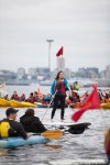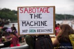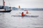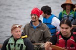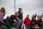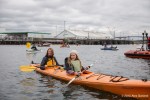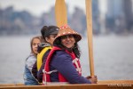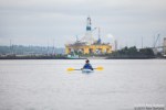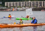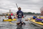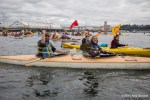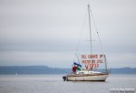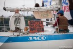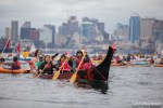 As kayaktivists began to arrive, boats were lined up and wetsuits donned. After a few last minute instructions and reminders about safety zones and kayaking tips, kayaks and canoes were launched. As hundreds of kayaks linked together in a flotilla, a path was made for the West Seattle Water Taxi and a watchful eye was kept by both Seattle Police, Seattle Fire Department, and the Coast Guard. A barge was set up with amplified sound and enough solar panels to power a large house, as a program was held on the water by native speakers and singers.