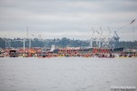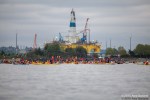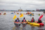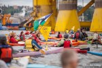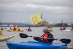 Under grey skies and on calm waters, hundreds of activists in kayaks paddled alongside Indigenous canoe families, sailboats of all sizes, paddle boards, inflatable boats, and other small watercraft to protest Shell’s Polar Pioneer, currently moored at the Port of Seattle’s Terminal 5.