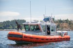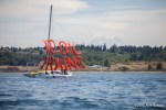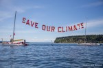 As Mt. Rainier provided the dramatic scenery, two sailboats raised a banner between them that read “Save Our Climate”. The boats rotated between showing their banners to the land and to those watching the events from the water, well behind the Coast Guards 1000 yard “security” zone. Armed Coast Guard vessels along with a Pierce County Sheriff boat, one from Mercer Island Police, and also from the Department of Homeland Security Customs and Border Patrol, patrolled the “security” line, warning kayaks, spectator powerboats, and sailboats as they drifted with the current, that they had crossed the line.