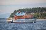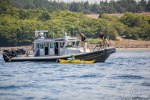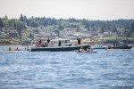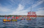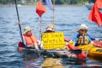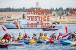 The Seattle Raging Grannies sang from the powerboat as activists from Olympia, Tacoma, and as far as Salem, Oregon joined them from the water. One paddler from Puyallup, Chris Canfield, says “You guys are out here saying hey, this what we believe in, this is our message. It’s a good message.” After four hours of paddling some activists were feeling the effects of the sun and strong current. Activists began to turn back and some were towed as the tide began to change and the wind began to slacken. No arrests were made and all activists returned safely.