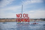 Activists in kayaks, canoes, pontoons and sailboats, visited Chambers Bay during the U.S. Open with signs protesting climate change and oil trains as Professional Golf Association pro’s trod the dead grass of the brown fairways. Boats from the water could easily see the effects of warmer days and drought conditions in Western Washington as the brown of the golf course stood out against the evergreens and blue sky. One catamaran hoisted a massive banner that read “No Oil Trains” as Burlington Northern Santa Fe locomotives pulled trains of boxcars and oil tankers between the course and the water. Activists mentioned that during the train watch, up to four entire trains of Bakken Crude tankers went by the course daily, yet during the tournament, none did.