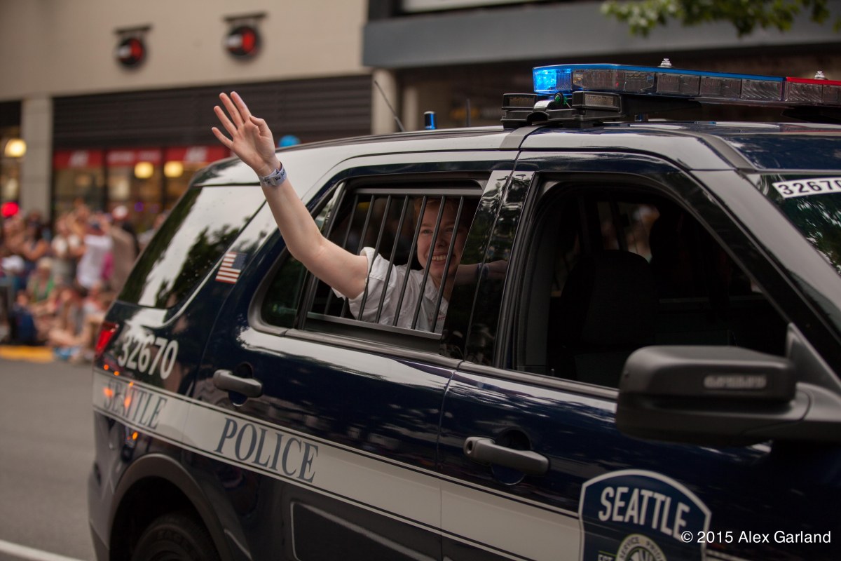 No idea. This was part of the SPD contingent and the person in the back of the car was waving to the crowd like they were part of the parade.
