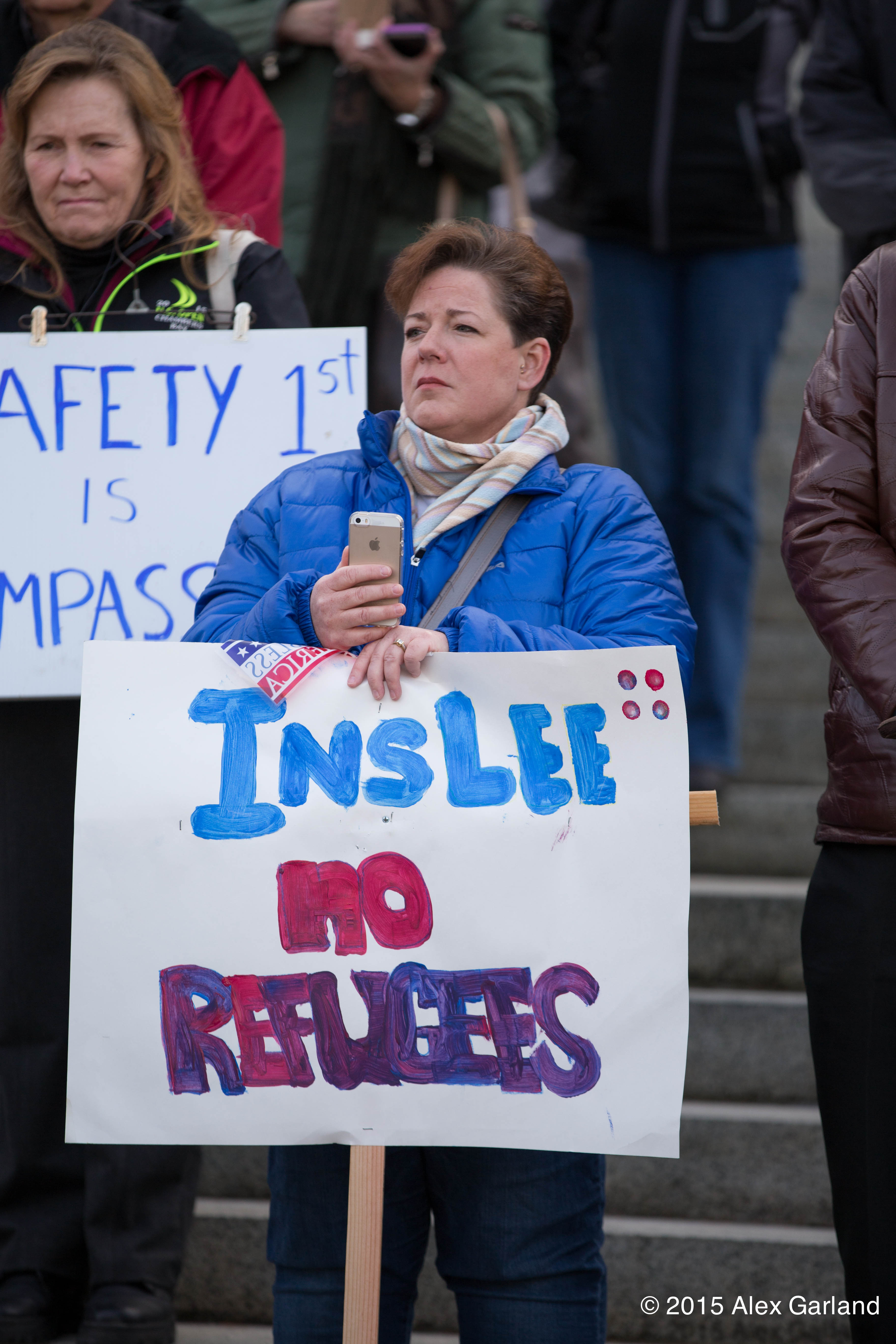 IMG_9042-2 Published November 20, 2015 at 3648 × 5472 in Anti-refugee protest at Washington State Capitol in Olympia met by larger group of pro-refugee demonstrators ← Previous Next →