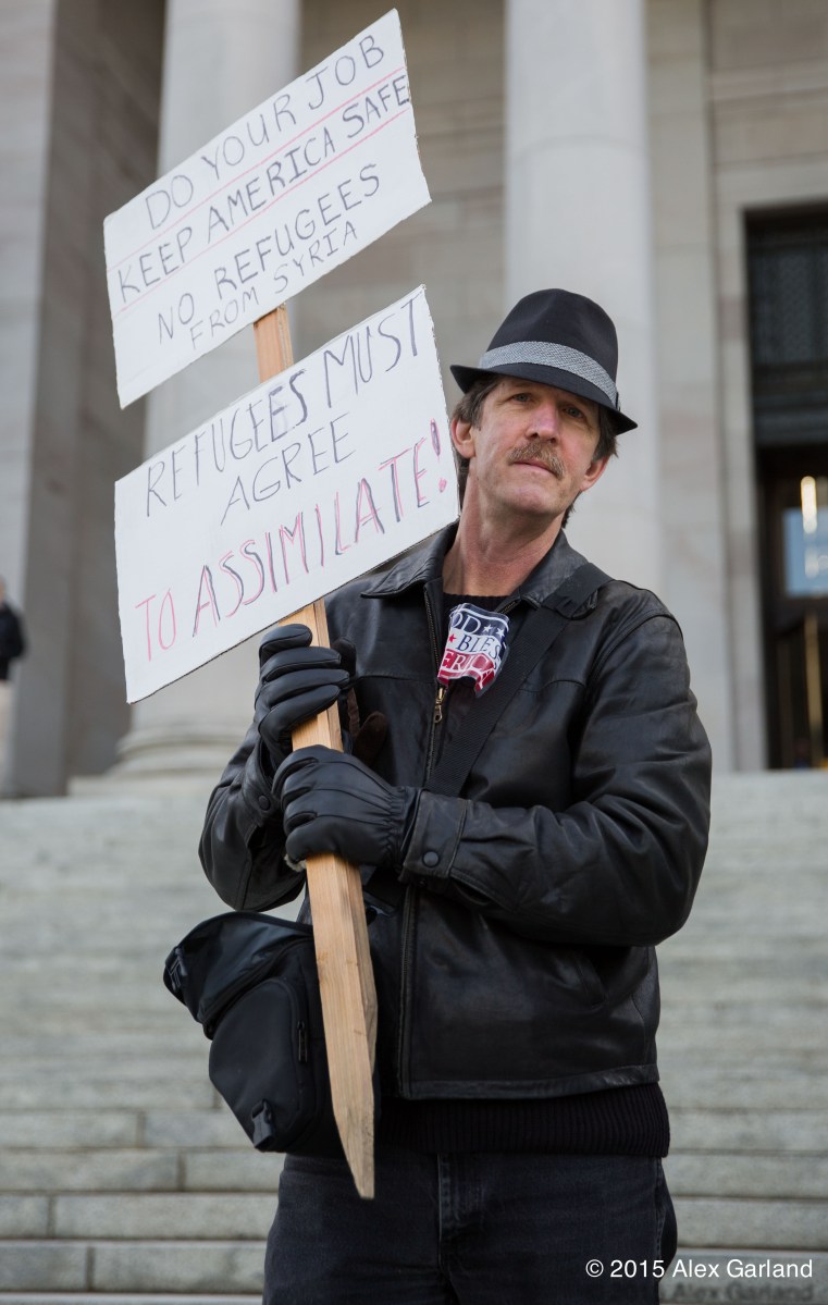 IMG_9085 Published November 20, 2015 at 3060 × 4825 in Anti-refugee protest at Washington State Capitol in Olympia met by larger group of pro-refugee demonstrators ← Previous Next →