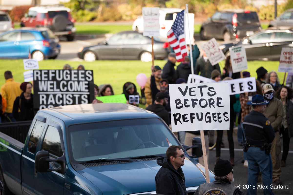 IMG_9090-2 Published November 20, 2015 at 5472 × 3648 in Anti-refugee protest at Washington State Capitol in Olympia met by larger group of pro-refugee demonstrators ← Previous Next →