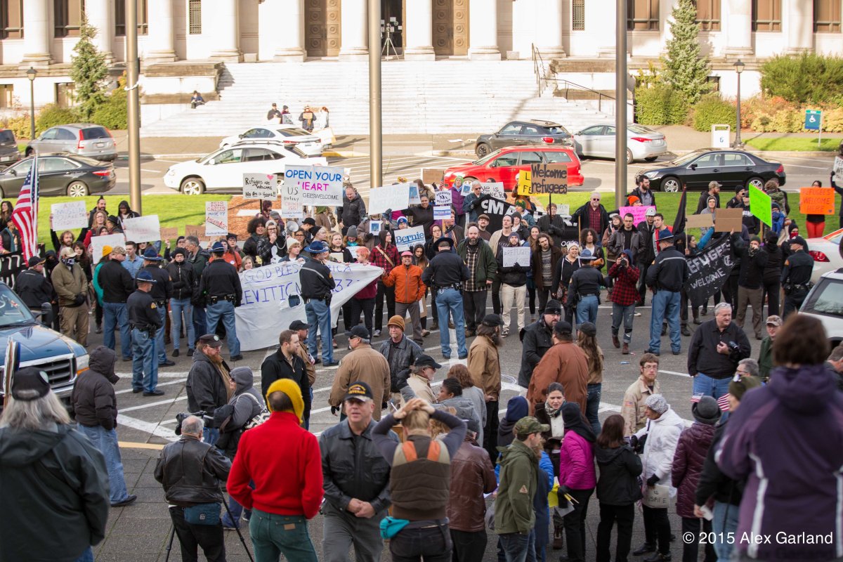 IMG_9094-2 Published November 20, 2015 at 5472 × 3648 in Anti-refugee protest at Washington State Capitol in Olympia met by larger group of pro-refugee demonstrators ← Previous Next →