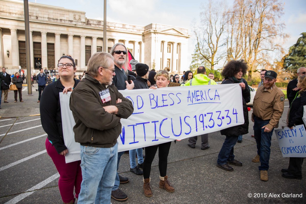 IMG_9118 Published November 20, 2015 at 5760 × 3840 in Anti-refugee protest at Washington State Capitol in Olympia met by larger group of pro-refugee demonstrators ← Previous Next →