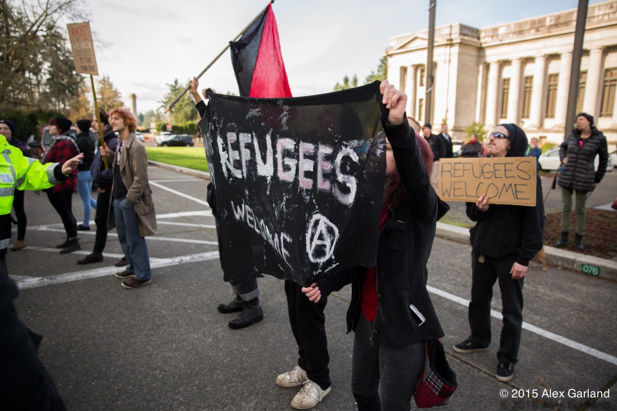 IMG_9146 Published November 20, 2015 at 5760 × 3840 in Anti-refugee protest at Washington State Capitol in Olympia met by larger group of pro-refugee demonstrators ← Previous Next →