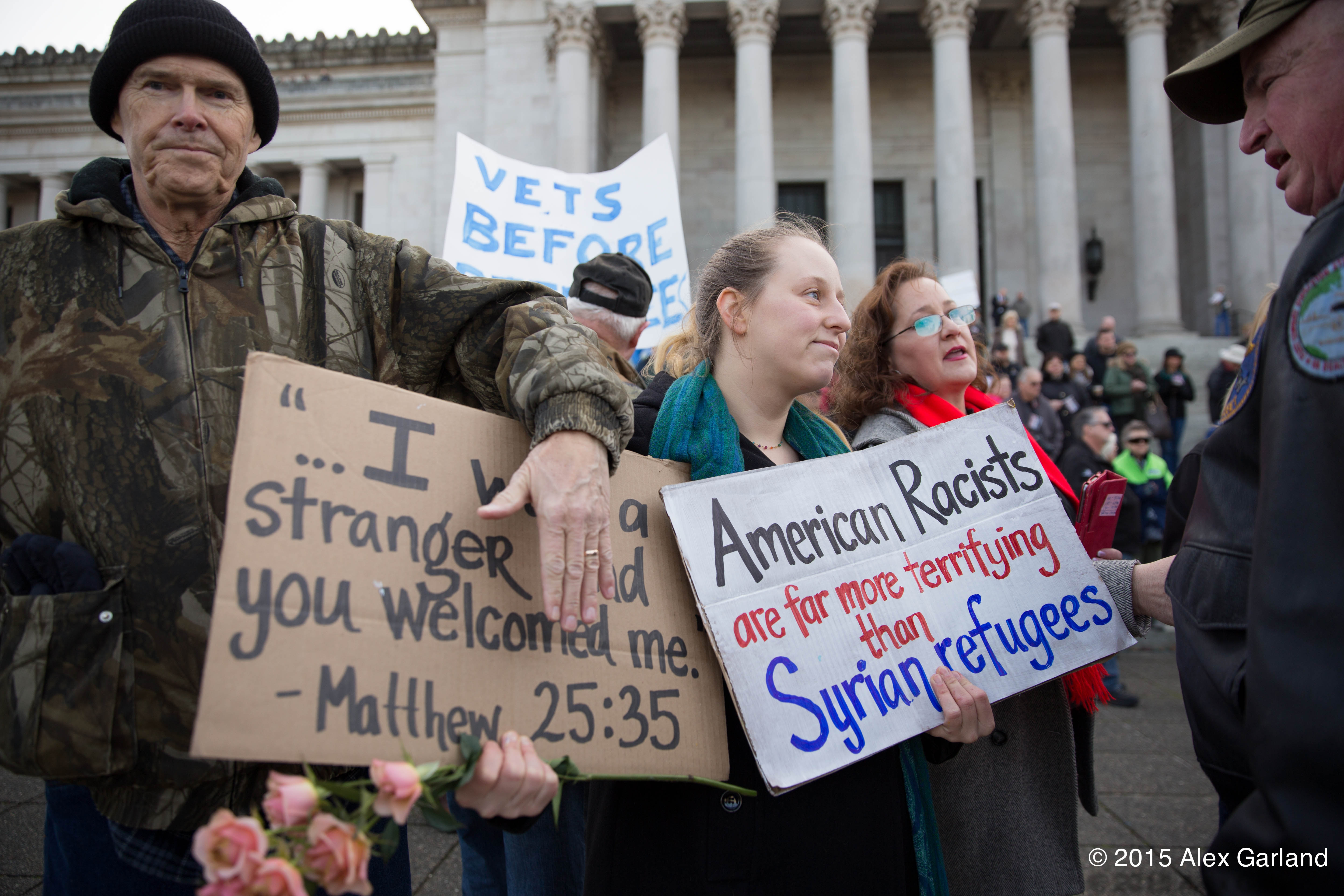 IMG_9339 Published November 20, 2015 at 5760 × 3840 in Anti-refugee protest at Washington State Capitol in Olympia met by larger group of pro-refugee demonstrators ← Previous Next →