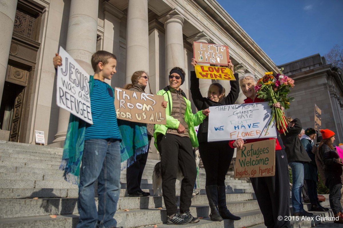 IMG_9709 Published November 20, 2015 at 5760 × 3840 in Anti-refugee protest at Washington State Capitol in Olympia met by larger group of pro-refugee demonstrators ← Previous Next →