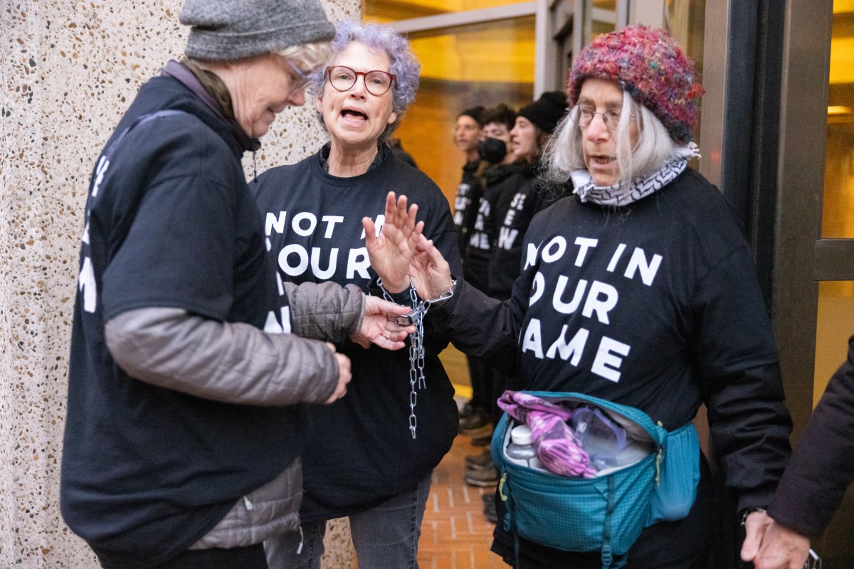 0A8A7595 Published November 3, 2023 at 2738 × 1826 in Activists with Jewish Voice for Peace shut down Seattle Federal Building Next →