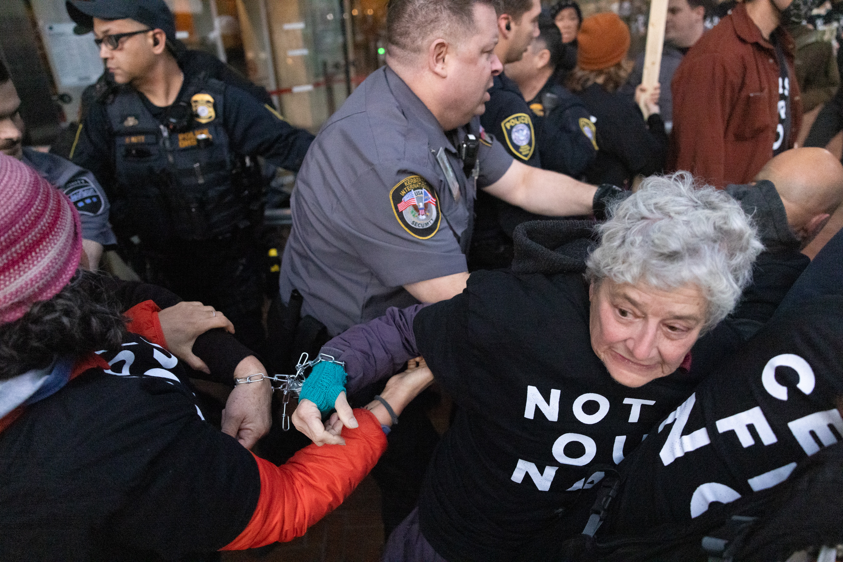 0A8A7855 Published November 3, 2023 at 2738 × 1826 in Activists with Jewish Voice for Peace shut down Seattle Federal Building ← Previous Next →