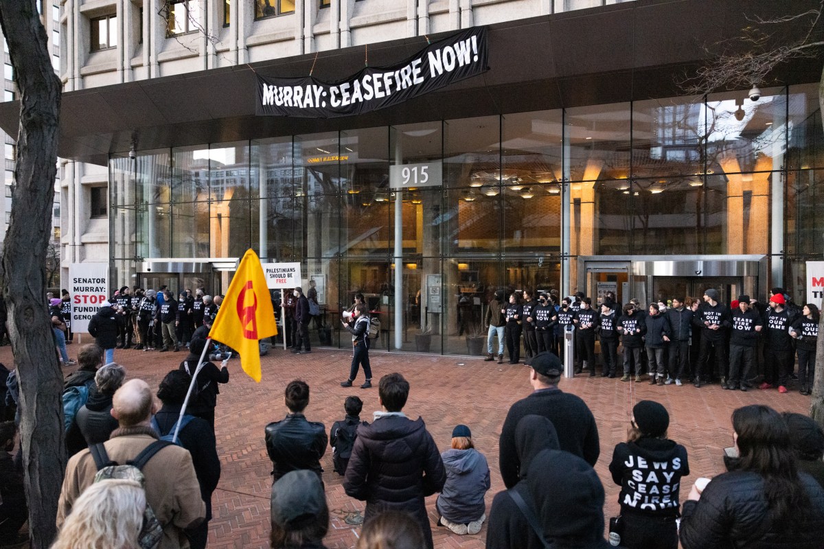 0A8A8033 Published November 3, 2023 at 2738 × 1826 in Activists with Jewish Voice for Peace shut down Seattle Federal Building ← Previous Next →