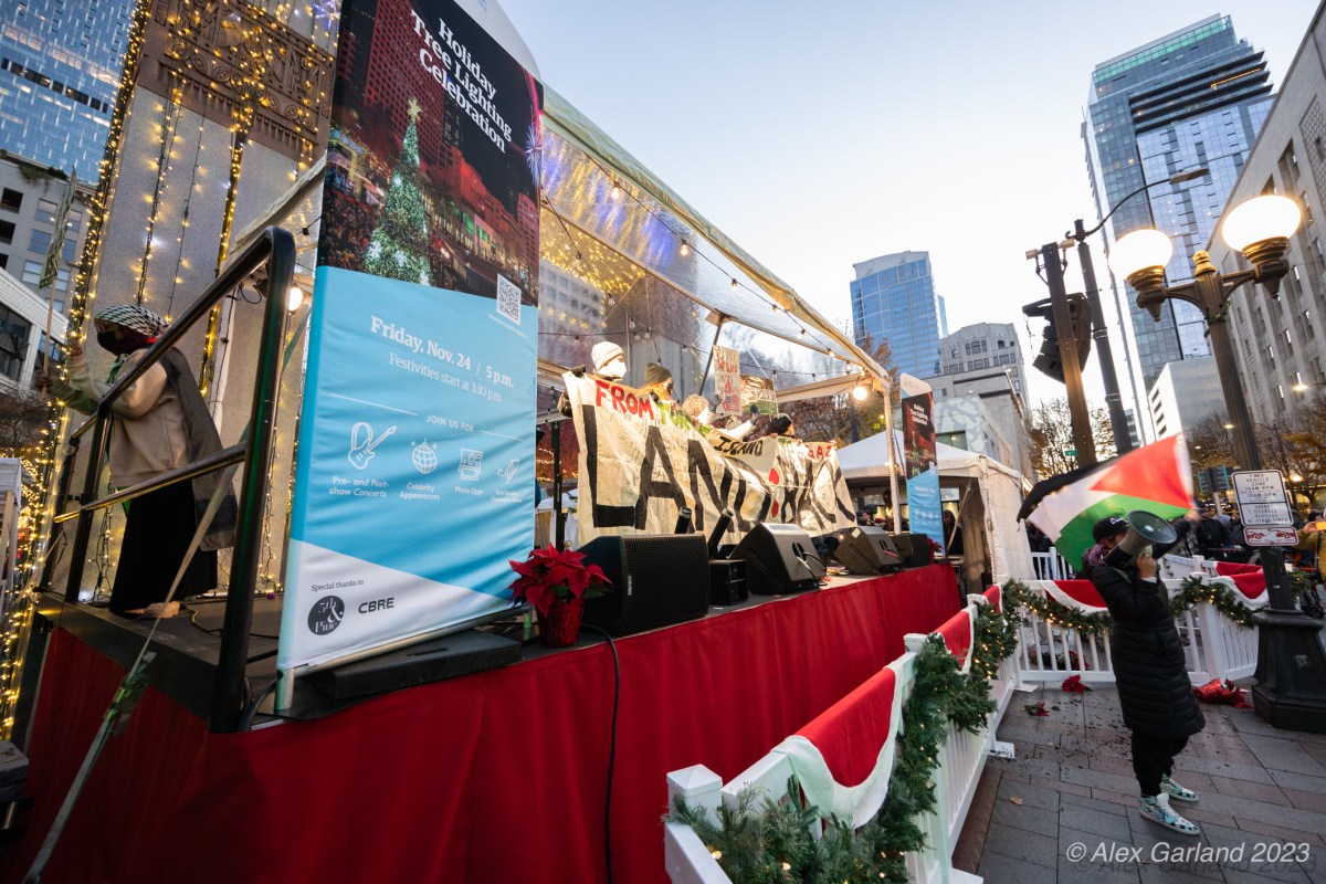 B35A9419 Published November 24, 2023 at 2121 × 1414 in Seattle Protest for Palestine Shuts Down Capitol Hill Starbucks and Disrupts Westlake Christmas Tree Lighting ← Previous