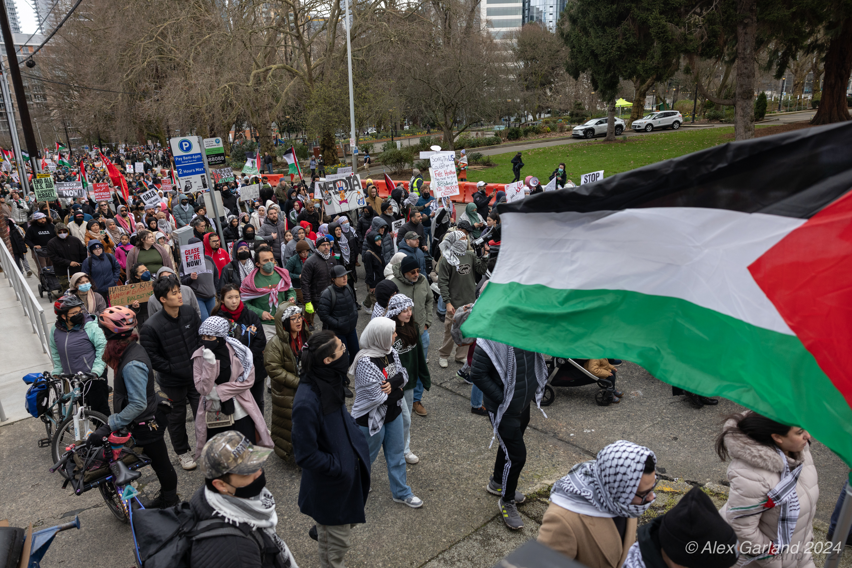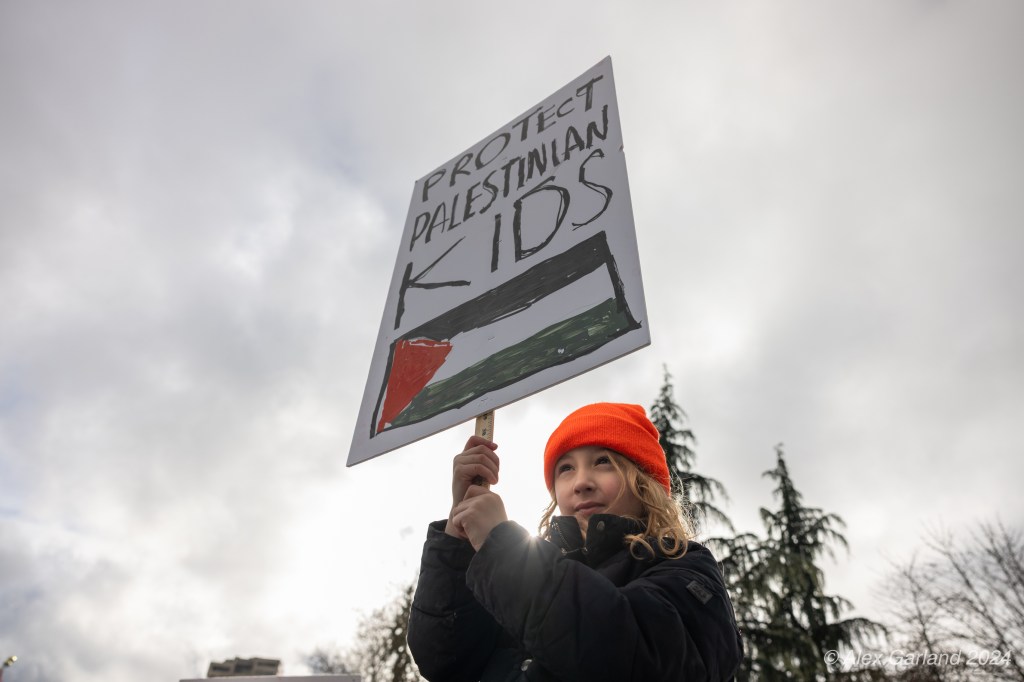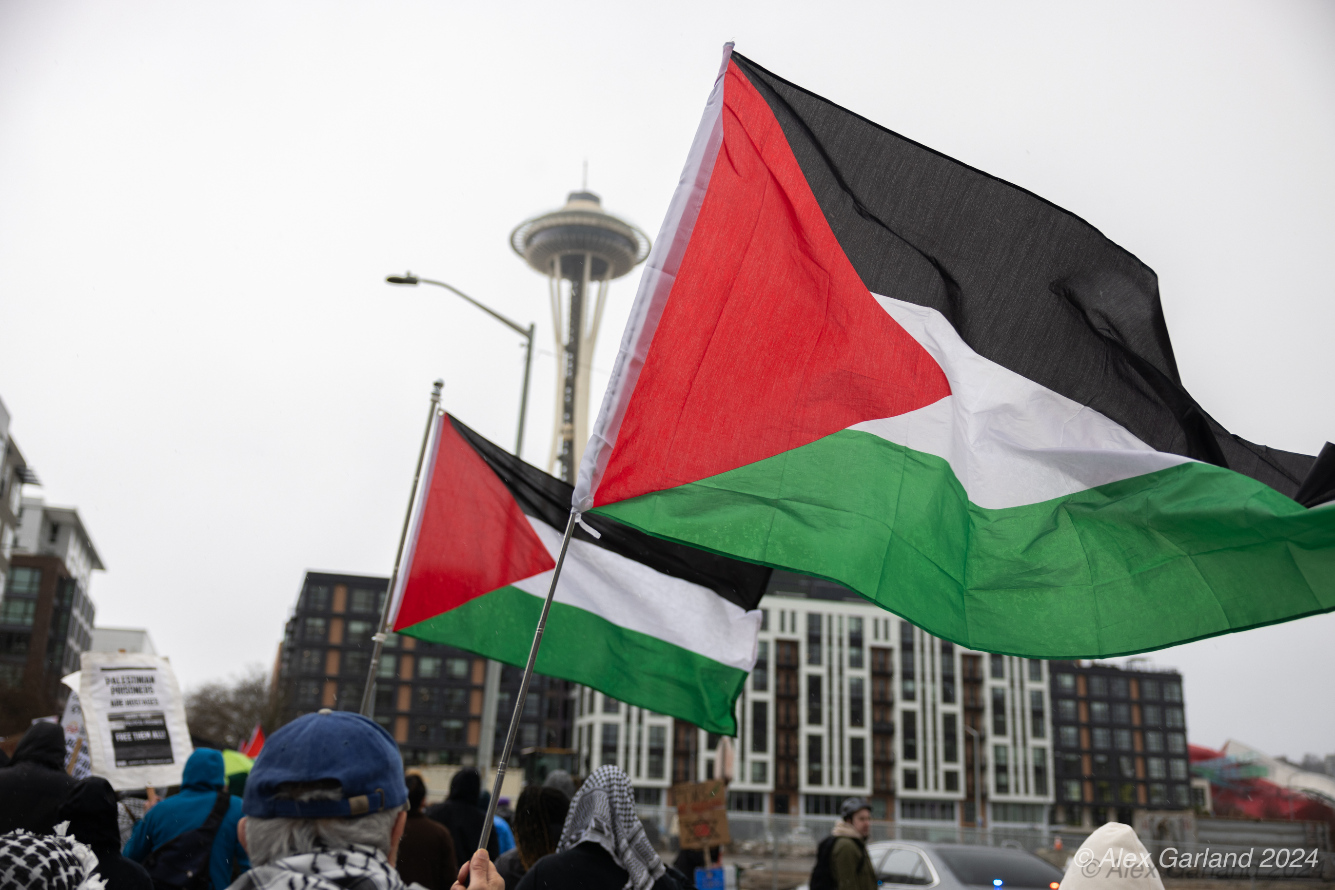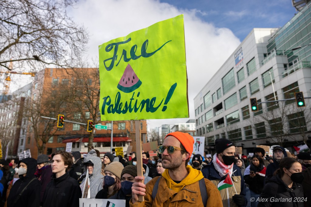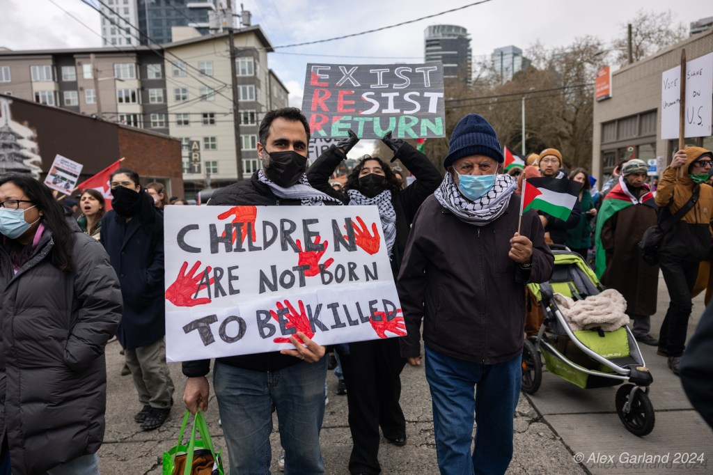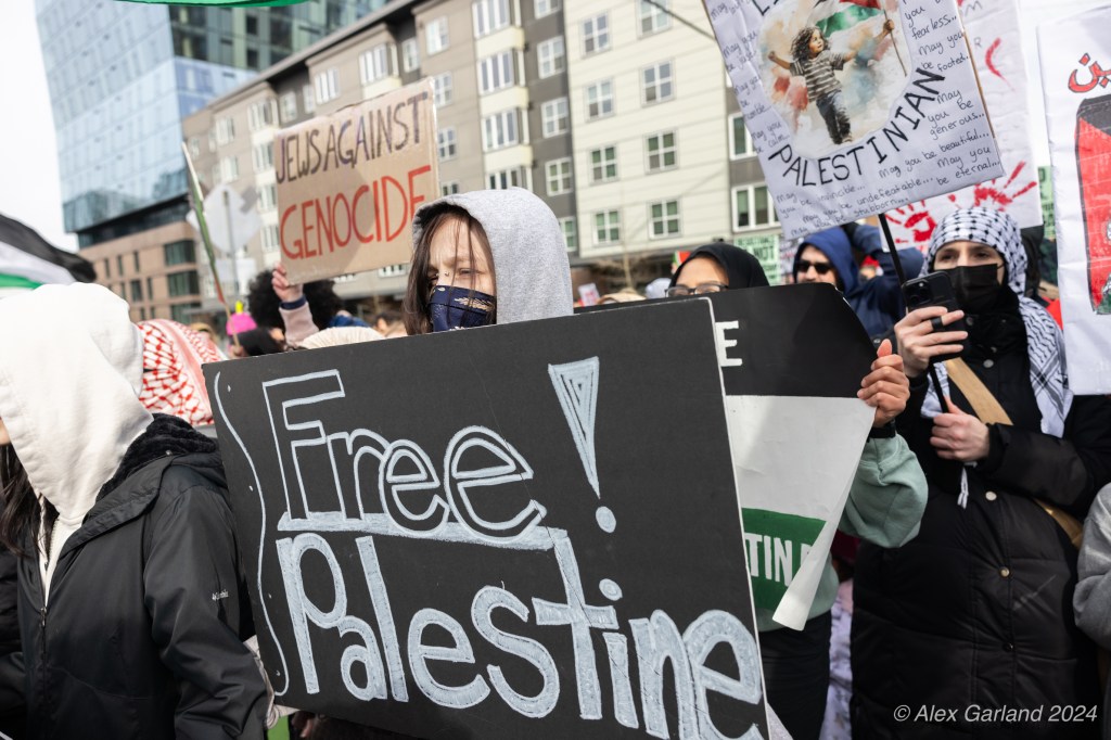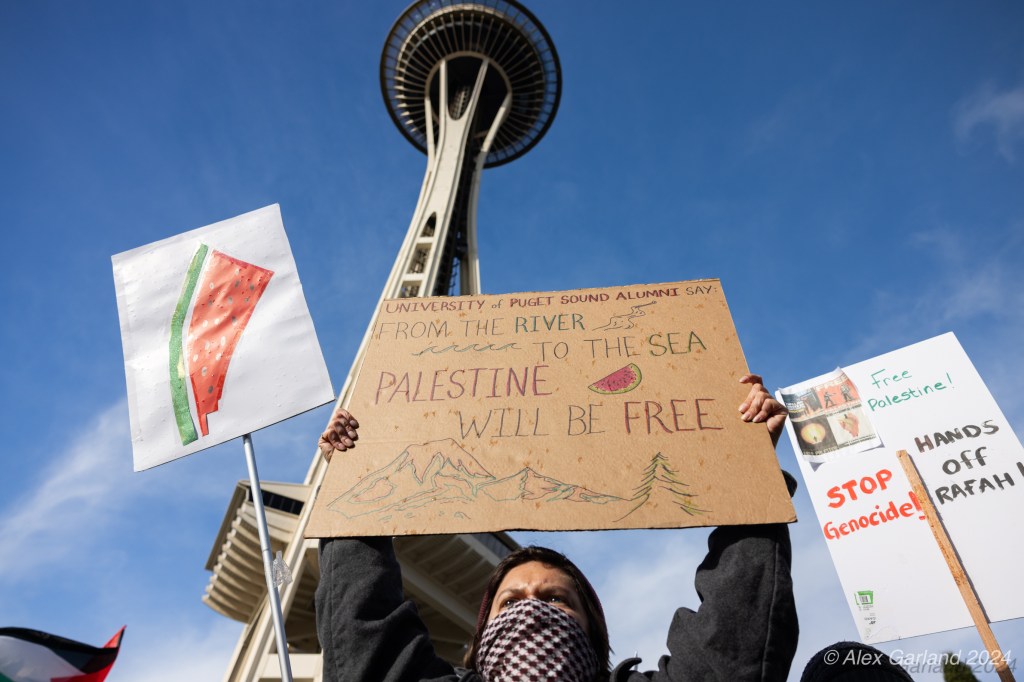 More than 1000 marched in protest of Israel’s targeting of Rafah. Rafah is the Southernmost region of Gaza at an area of 25 square miles, the same size as Renton, Washington. Rafah is also home to more than 1.2 million refugees, more than the population of Bothell, Seattle, and Renton, shoved into 25 square miles. The protest, while short in length, experienced rain, snow, sleet, and sunshine as it moved from Denny Park towards the ending destination at the Space Needle.