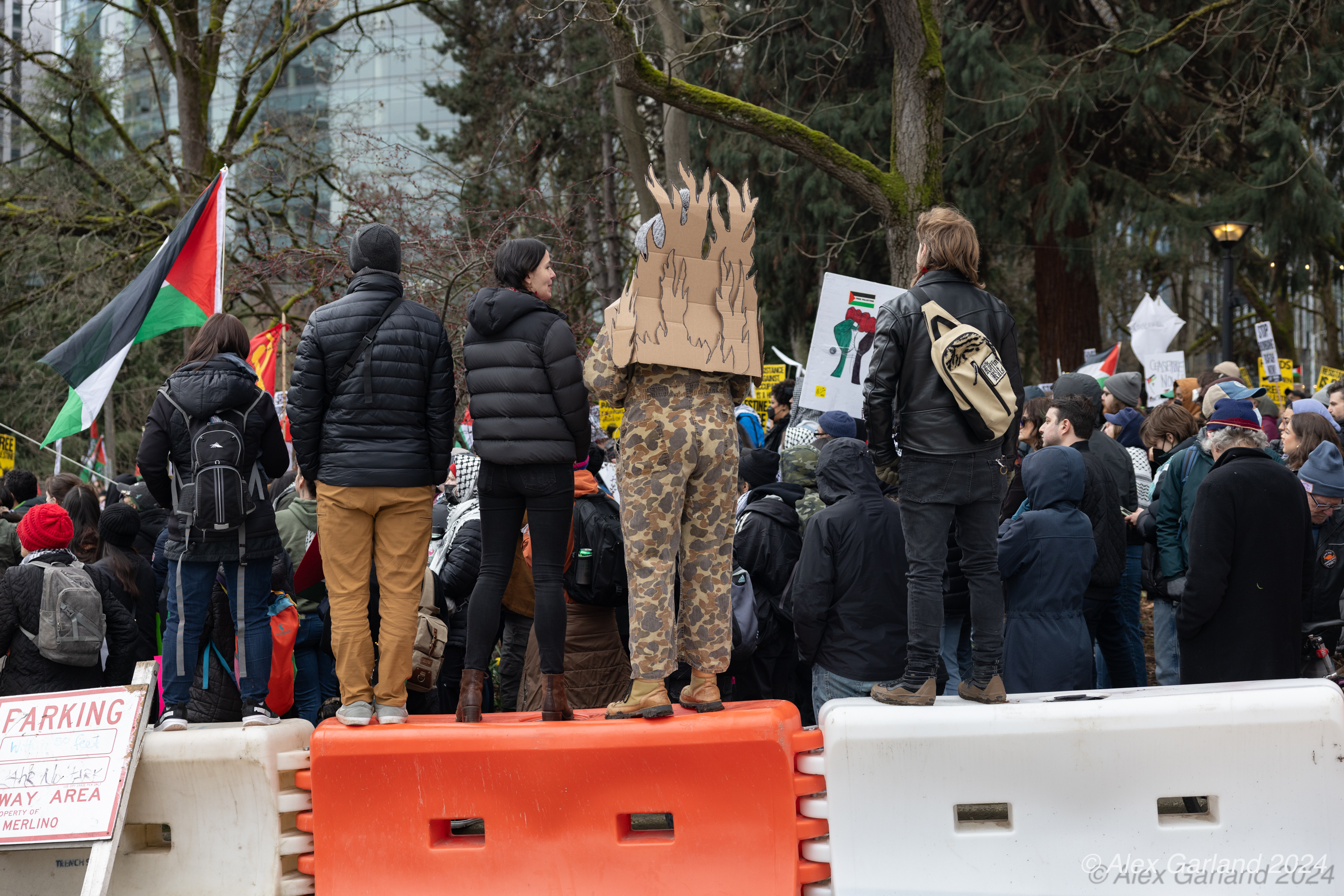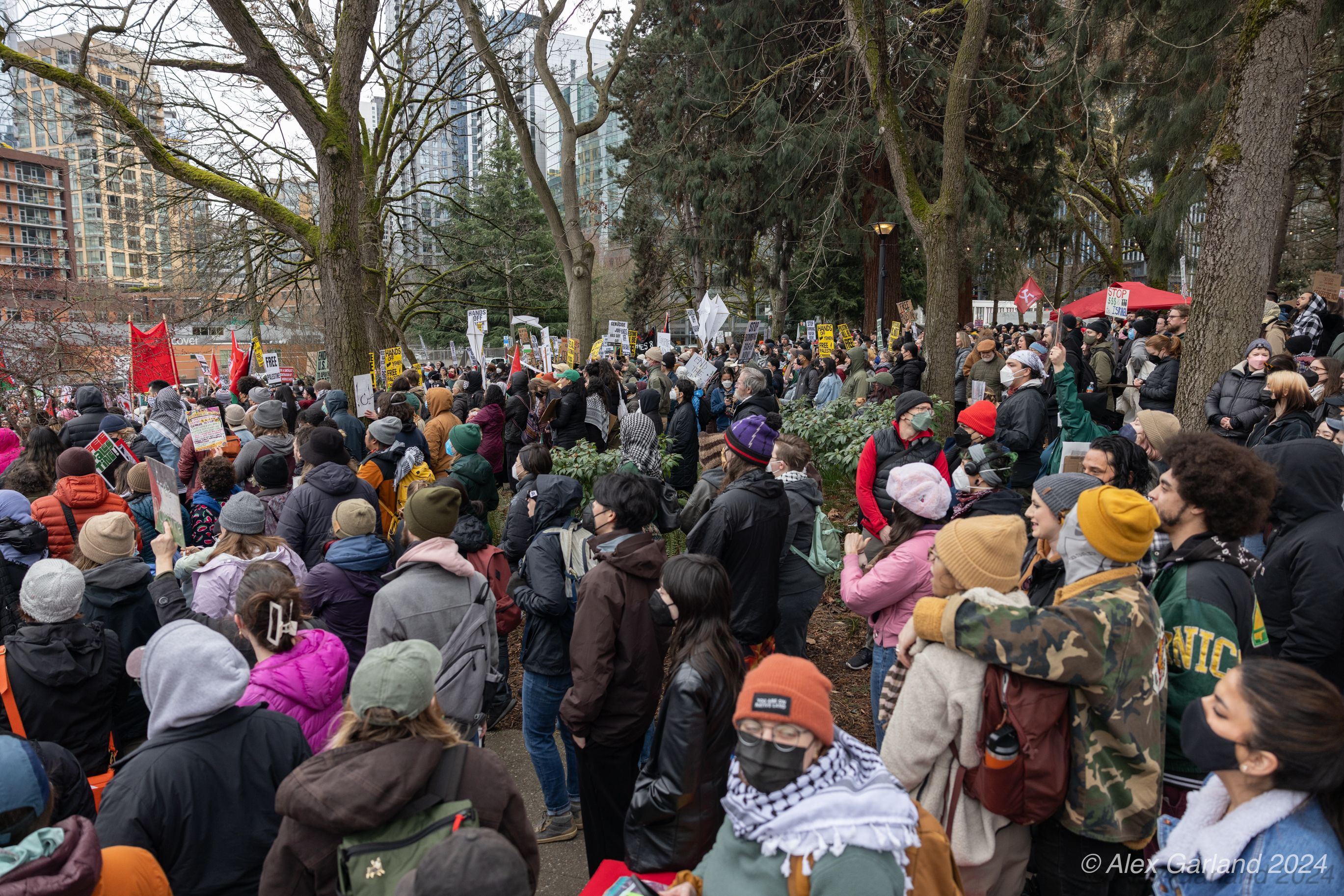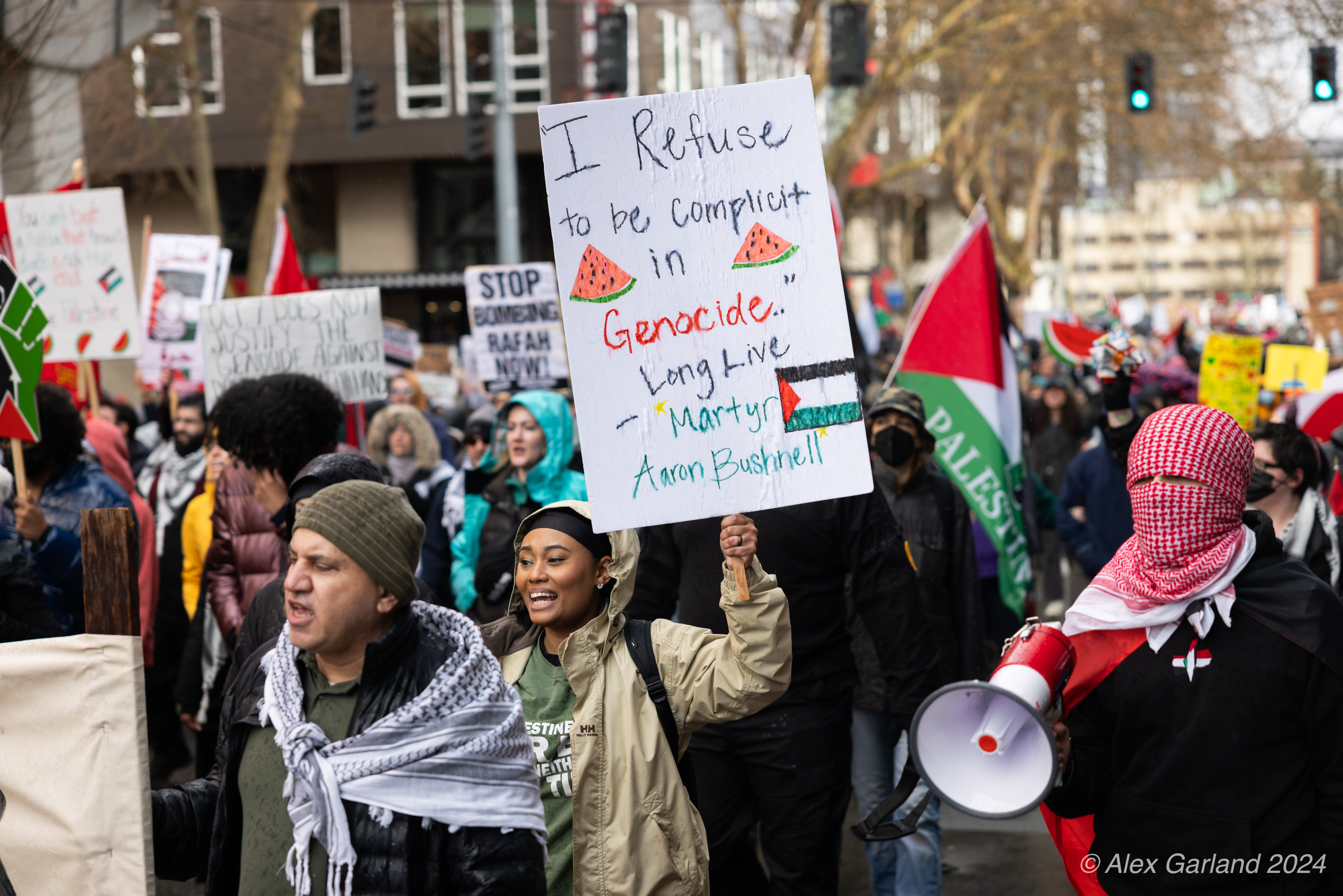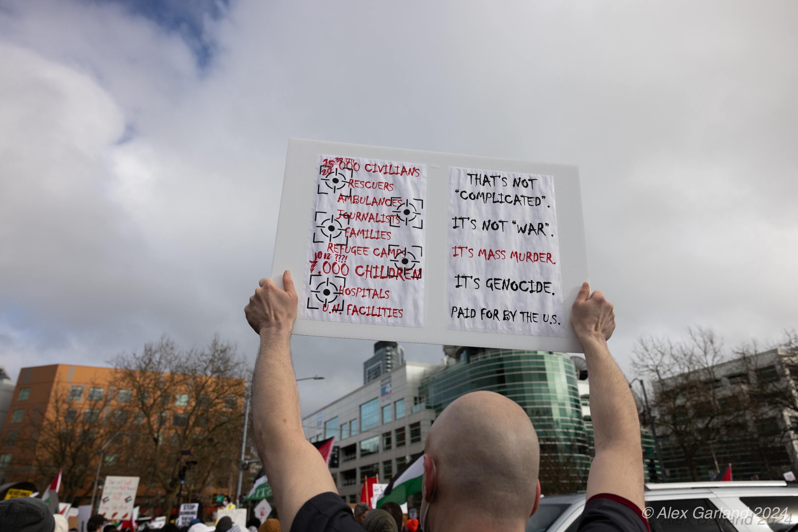 More than 1000 marched in protest of Israel’s targeting of Rafah. Rafah is the Southernmost region of Gaza at an area of 25 square miles, the same size as Renton, Washington. Rafah is also home to more than 1.2 million refugees, more than the population of Bothell, Seattle, and Renton, shoved into 25 square miles. The protest, while short in length, experienced rain, snow, sleet, and sunshine as it moved from Denny Park towards the ending destination at the Space Needle.