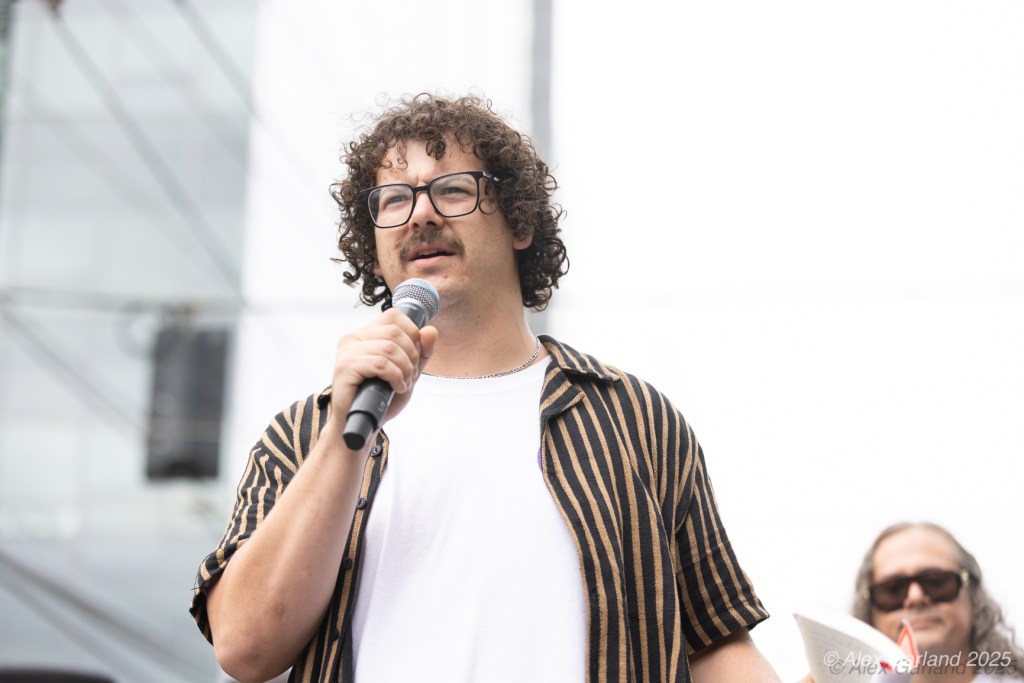 Executive Secretary-Treasurer or Laborers Local 242, Katie Garrow, connected Palantir’s practices to Washington’s labor history, drawing from three generations of family experience in the timber industry. “East Coast elites like Peter Thiel, other oligarchs like Friedrich Weyerhaeuser, owned our forests,” they said, “but my family and thousands of other timber workers over those three generations, fought. They won their unions and they won middle class lives despite incredible odds.”