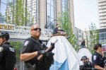 At least 40 activists gathered outside the lobby of the Canadian Consulate in Seattle to protest the arrests of water protectors and activists at the Gidumt’en checkpoint on land belonging to the Wet’suwet’en Nation. The land is under threat from Coastal GasLink, a project of TransCanada Corporation, who has been constructing a 670-kilometer fracked gas pipeline that will carry fracked gas from Dawson Creek, B.C. to the coastal town of Kitimat, where LNG Canada’s processing plant would be located.