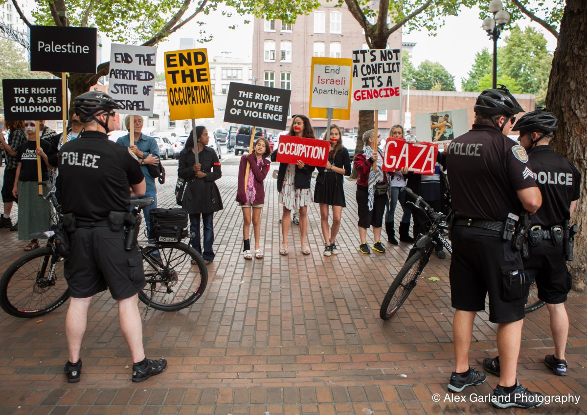 IMG_1117 Published July 24, 2014 at 4544 × 3218 Police guard a small number of pro Palestine supporters and activists as hundreds of pro Israel supporters chant and dance behind them.