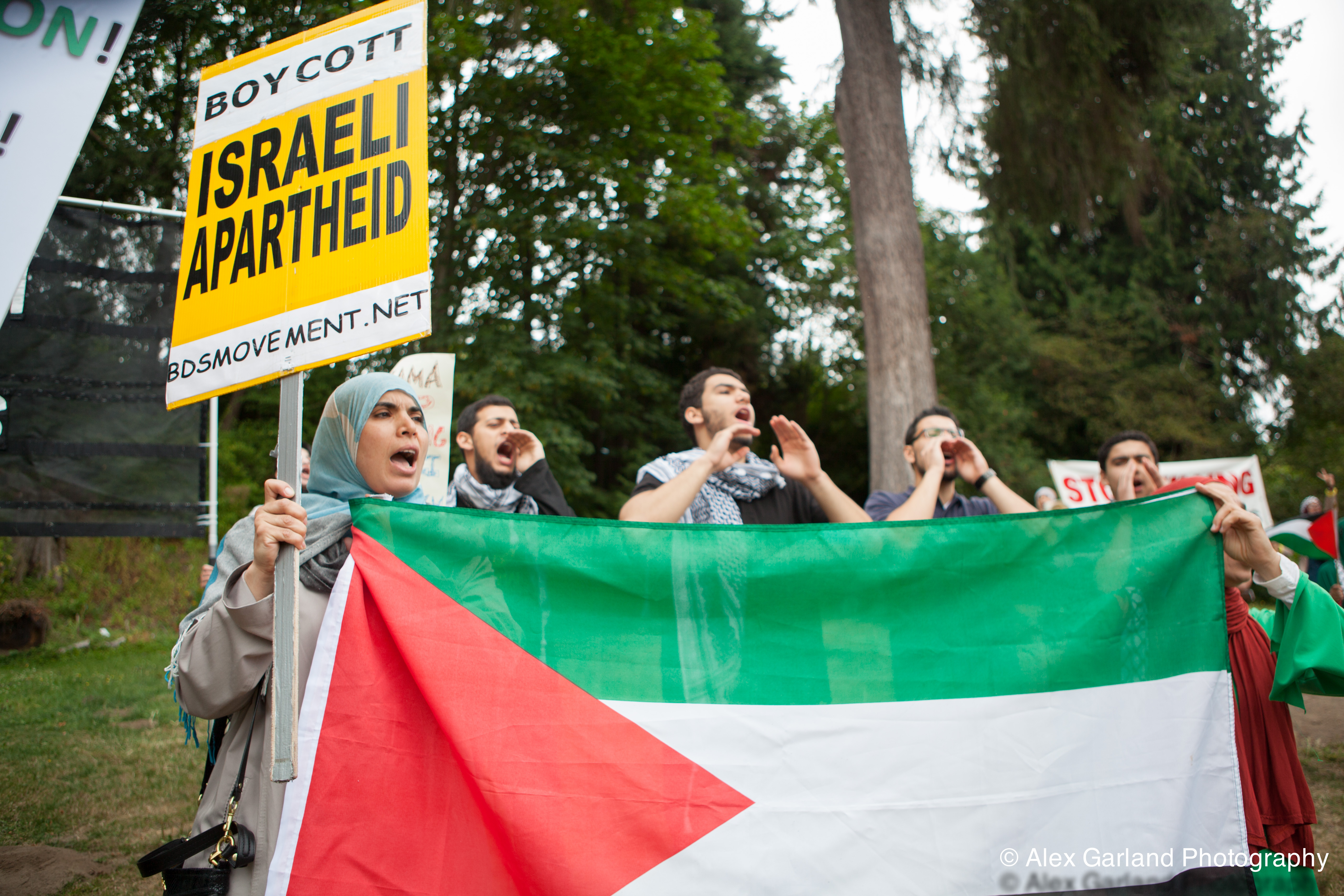 IMG_1948 Published July 24, 2014 at 5616 × 3744 Demonstrators chant, holding Palestinian flags and anti-Israeli apartheid signs