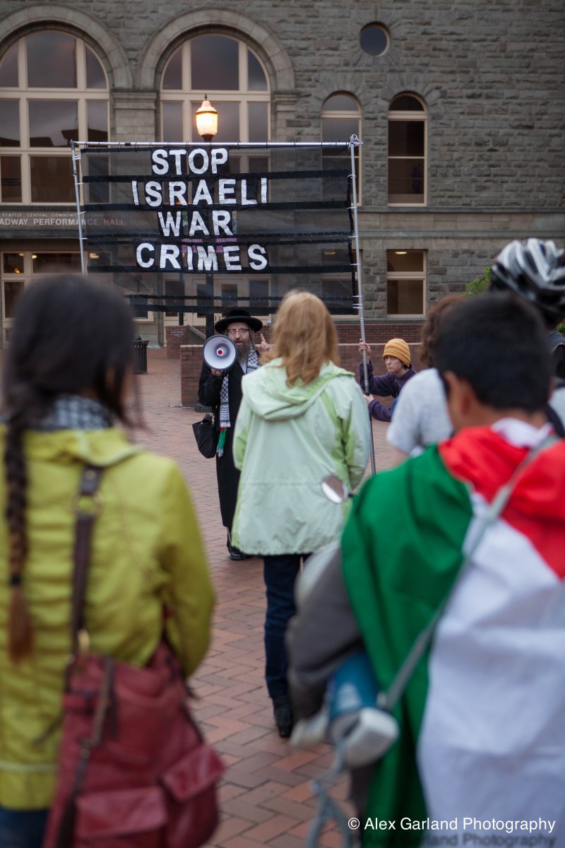 IMG_2399 Published July 25, 2014 at 3744 × 5616 Activists of the Anti-Genocide Noise Brigade listen to a Jewish supporter of Palestine, in town from NY for tomorrow Al Quds Day in Seattle.