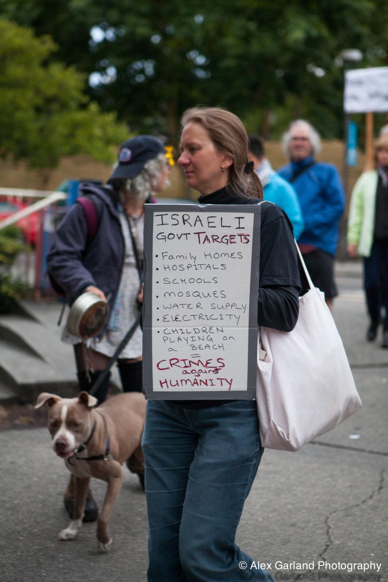 IMG_2491 Published July 25, 2014 at 3744 × 5616 A demonstrator carries a sign calling out Israeli war crimes as they march with the Anti-Genocide Noise Brigade