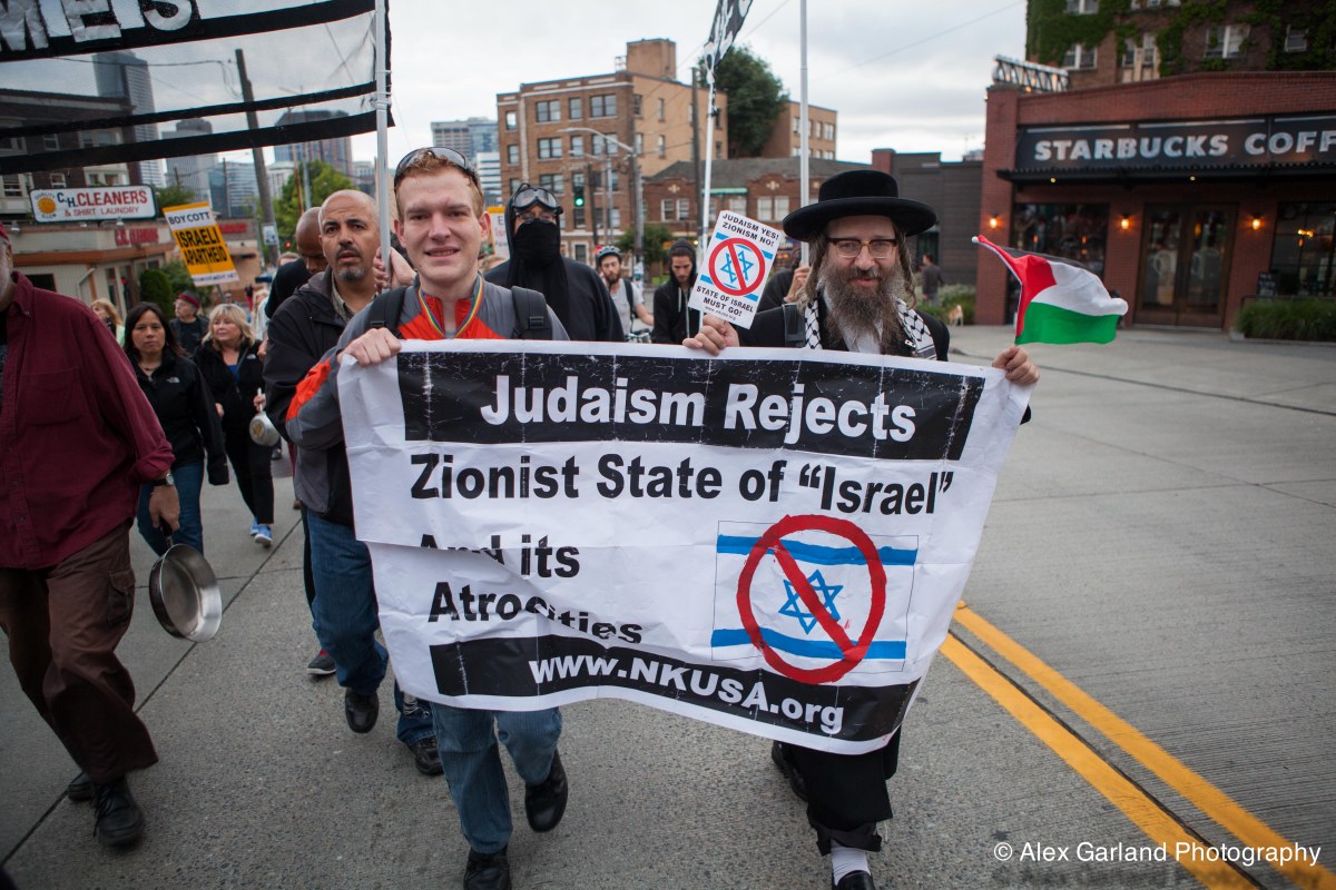 IMG_2638 Published July 25, 2014 at 5616 × 3744 Demonstrators carry signs protesting Israeli Zionism as they march past Starbucks in Seattle